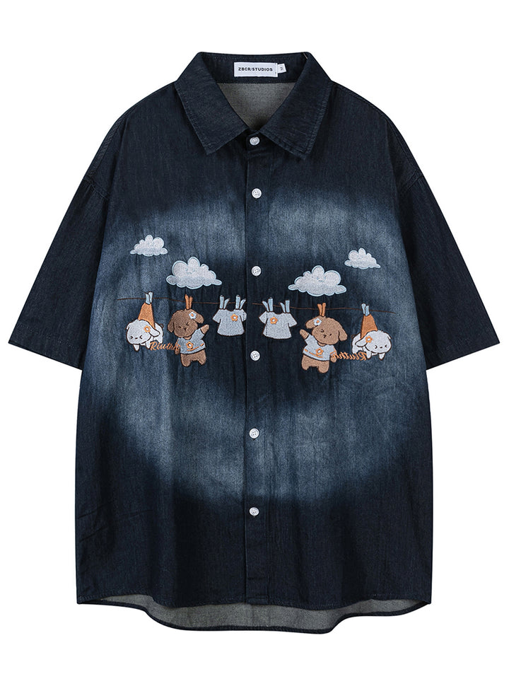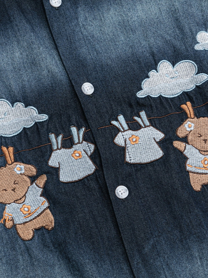 Add a touch of retro charm to your wardrobe with this American vintage washed denim shirt. Designed with playful cartoon animal embroidery, this shirt brings a fun, nostalgic vibe to your casual look. The unique faded denim wash gives it a worn-in, vintage appeal, while the embroidered bunnies and a cute dog create an eye-catching, whimsical touch. Made from a soft cotton blend, this shirt is both comfortable and durable for everyday wear.