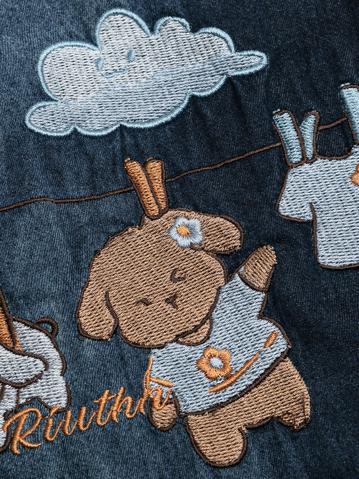 - Design: Fun cartoon animal embroidery featuring bunnies and a dog, with a unique vintage wash.