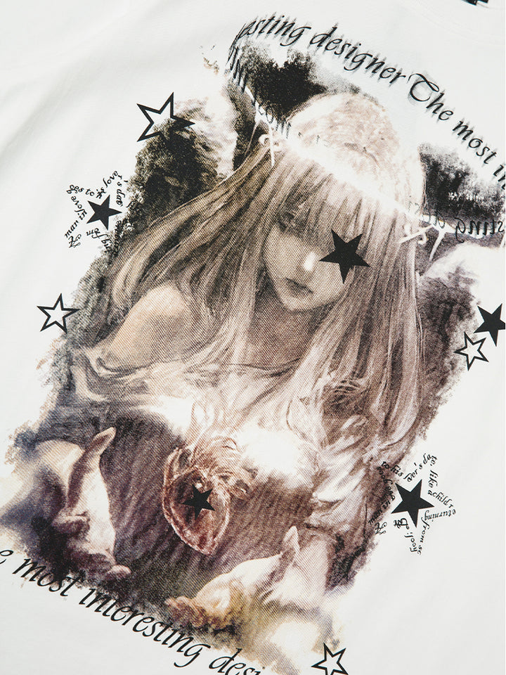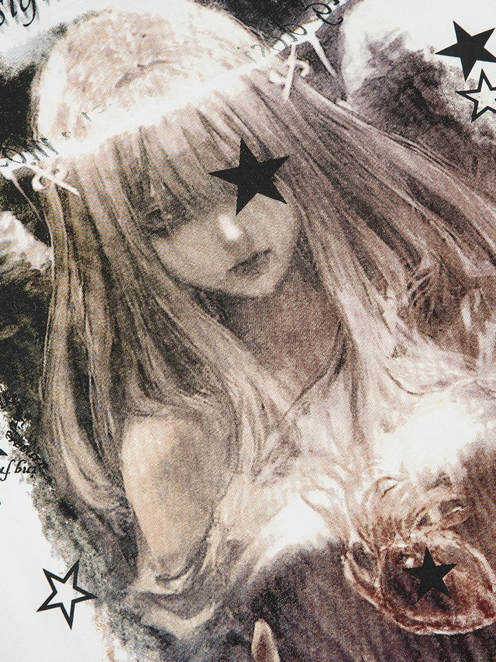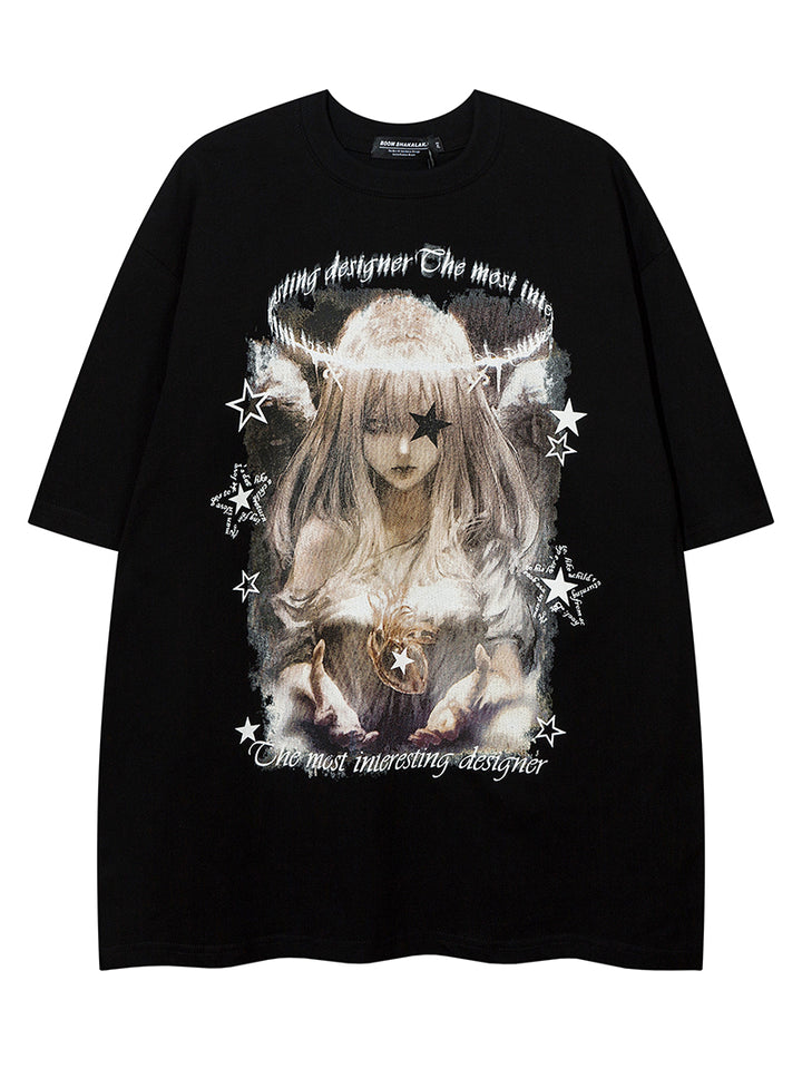 Express your individuality with this oversized unisex T-shirt, showcasing a striking anime-inspired angel girl surrounded by dreamy, gothic elements. The muted tones and surreal composition give it an artistic edge, making it a must-have for fans of Harajuku fashion, anime streetwear, and alternative style. Whether paired with cargo pants or layered under a jacket, this tee adds depth and character to any outfit.