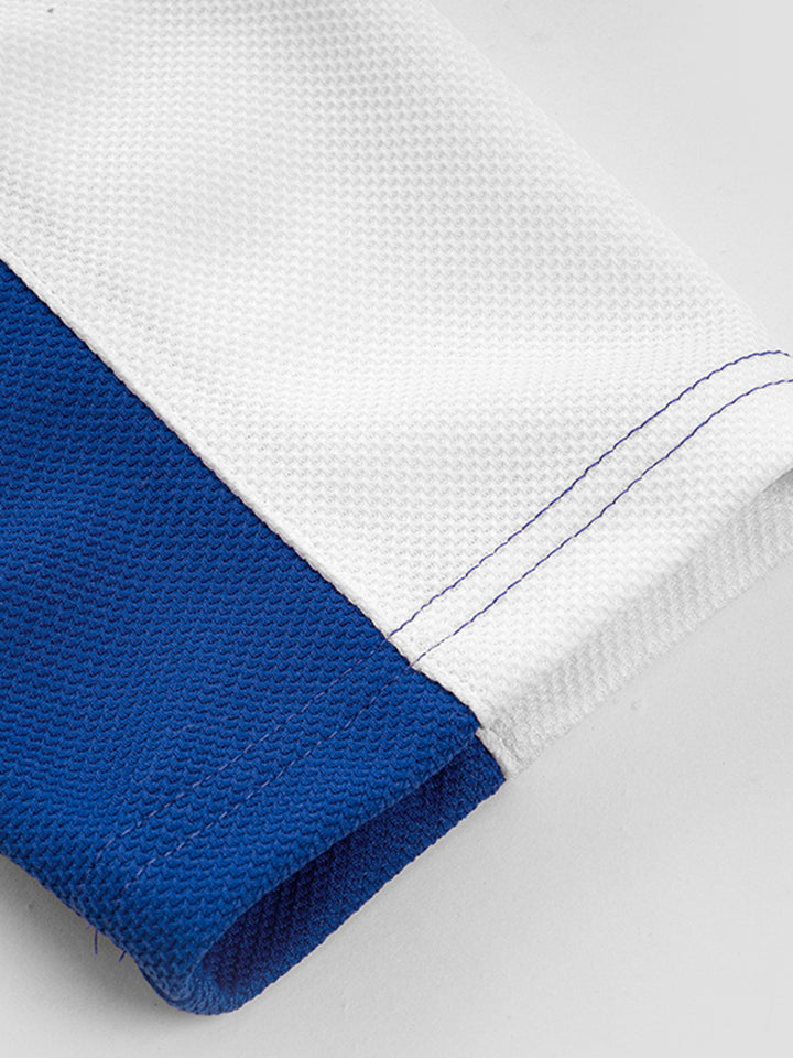 🔵 Classic Blue Color Block Design – Dynamic combination of deep blue and crisp white delivers a retro hockey jersey vibe.