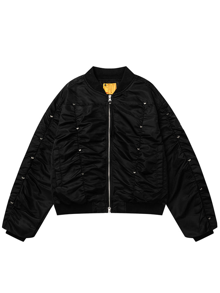 ✨ Unique Ruched Design – Eye-catching gathered stitching on the body and sleeves adds depth and a modern streetwear edge.
