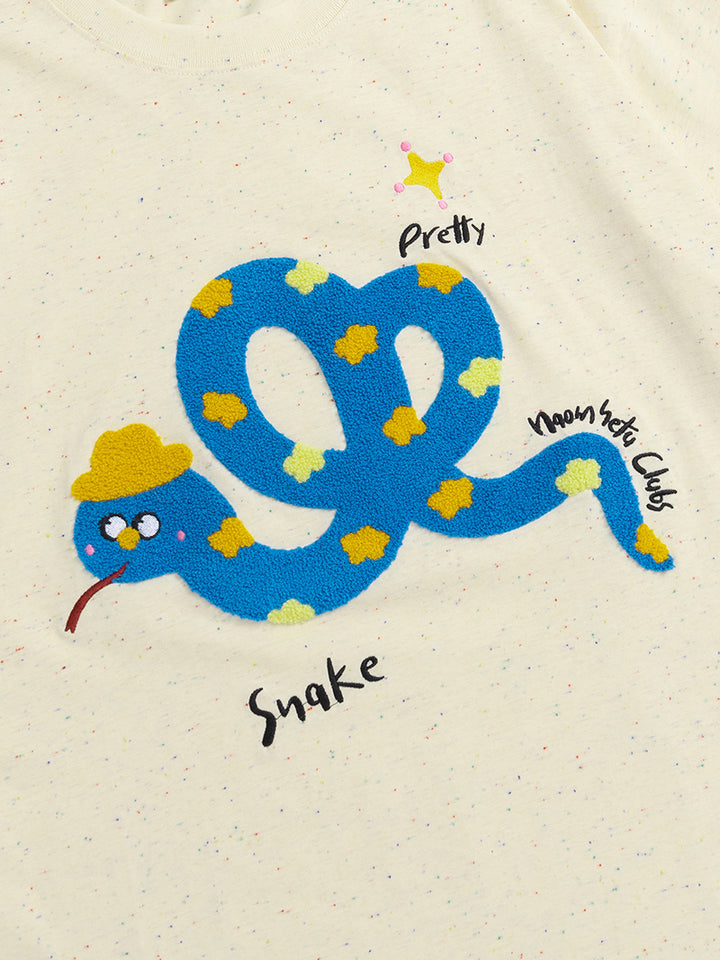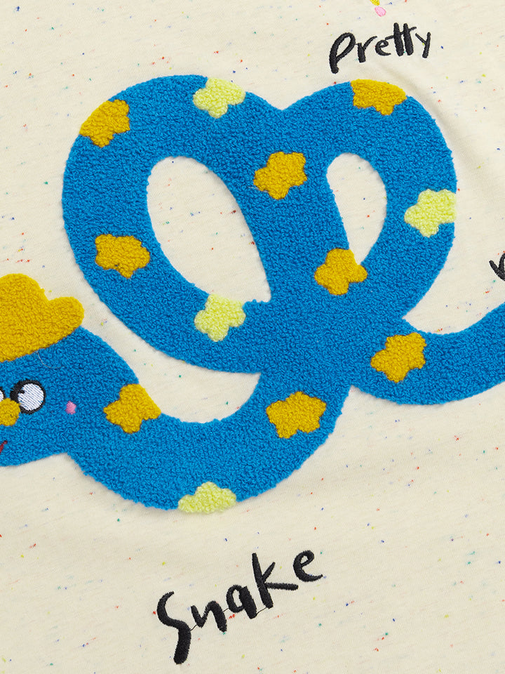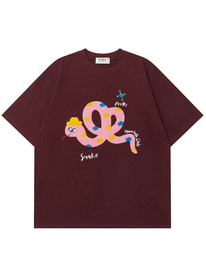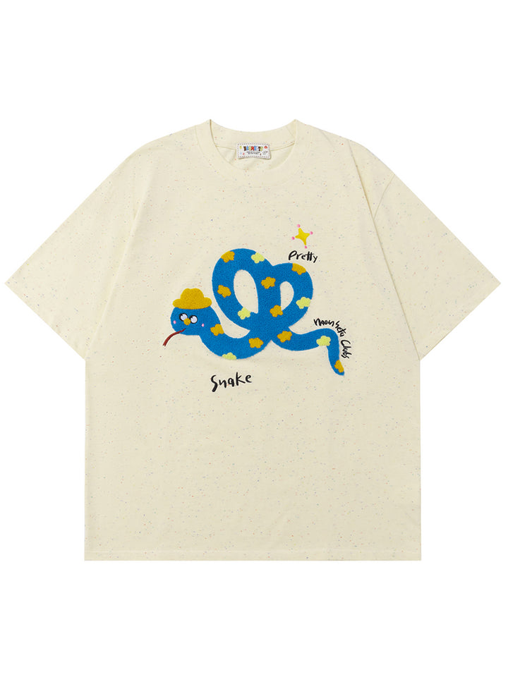 Inject some personality into your wardrobe with this charming graphic tee featuring a cute chenille-embroidered snake. The fuzzy terry-texture embroidery adds a unique three-dimensional touch to an otherwise minimalist design. Whether you're into quirky fashion or just want a comfy statement piece, this T-shirt is a standout. Ideal for daily wear, casual outings, or as a playful gift.