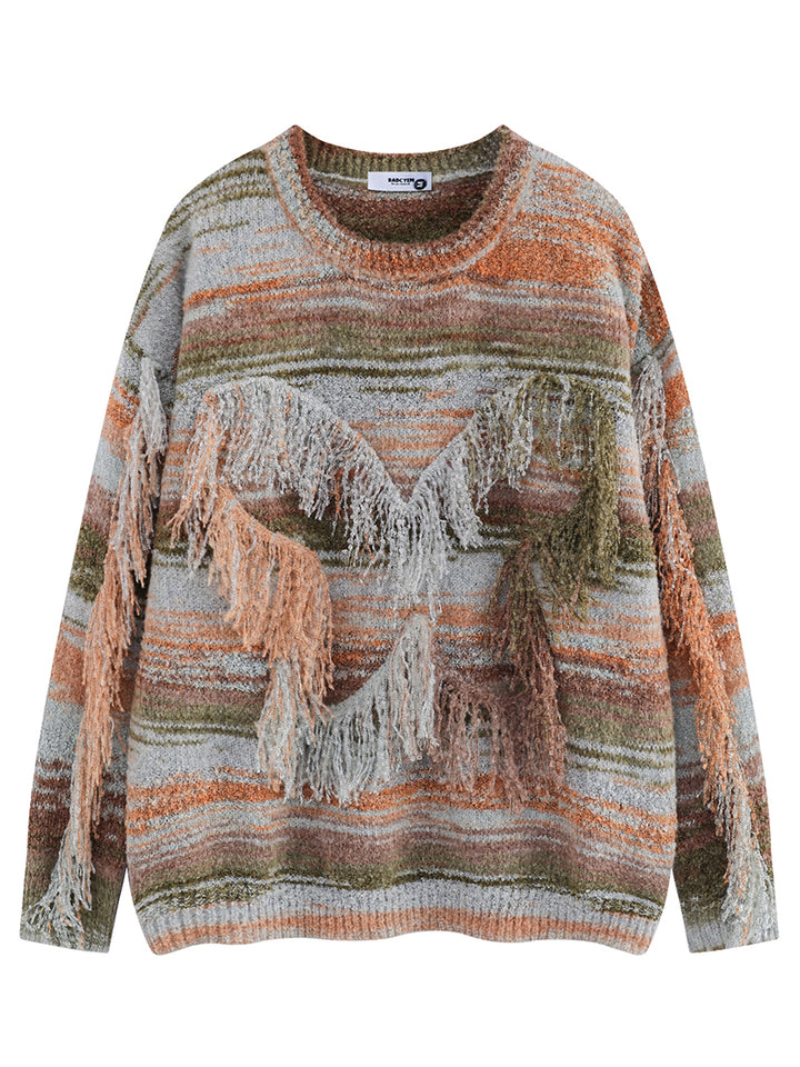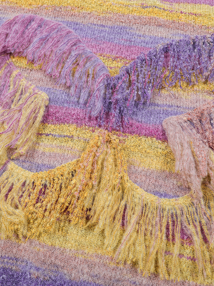 Bring bold texture and artistic charm to your wardrobe with this fringe-detailed knit sweater. Designed with a relaxed oversized fit, this pullover offers cozy comfort and vibrant personality. The blend of 50% viscose, 28% PBT, and 22% nylon delivers a soft, breathable feel that’s perfect for cool weather. Whether you’re heading out or lounging in style, the gradient color pattern and fun fringes make this sweater a unique choice. A great gift idea for anyone who appreciates expressive fashion with a cozy twist.