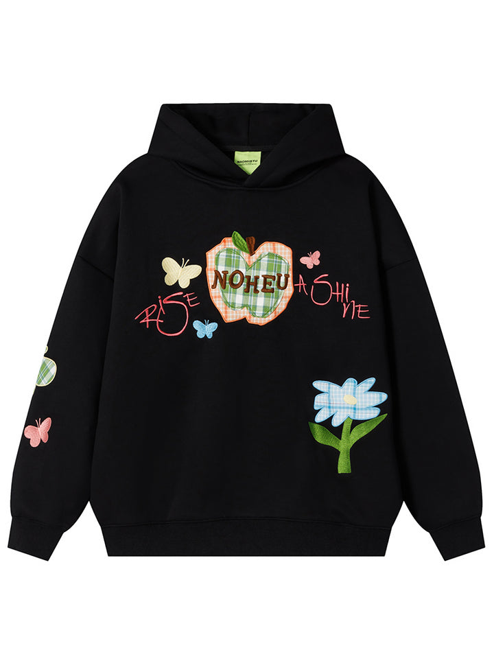 Add a fun and whimsical touch to your everyday style with this oversized hoodie featuring adorable embroidered butterflies, flowers, and a patchwork apple motif. Made from a premium 400g composite silver fox fleece blend of 65% cotton and 35% polyester, it delivers both warmth and softness while remaining breathable. The relaxed oversized silhouette ensures all-day comfort, perfect for lounging, layering, or pairing with your favorite jeans and sneakers. Available in white or black, this hoodie blends cozy comfort with creative design — an ideal choice for anyone who loves unique, expressive streetwear fashion.
