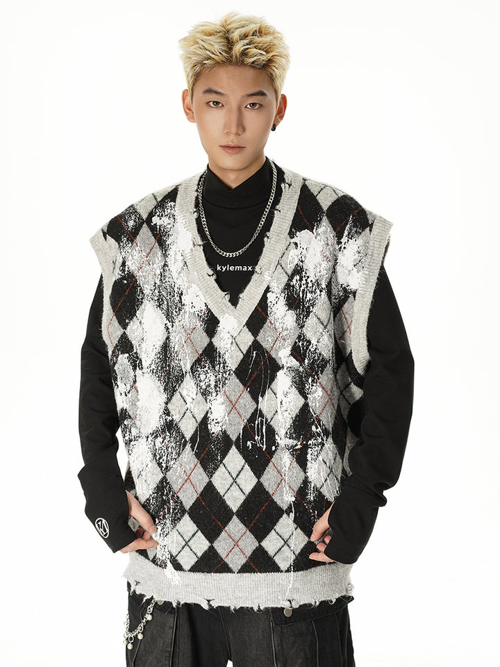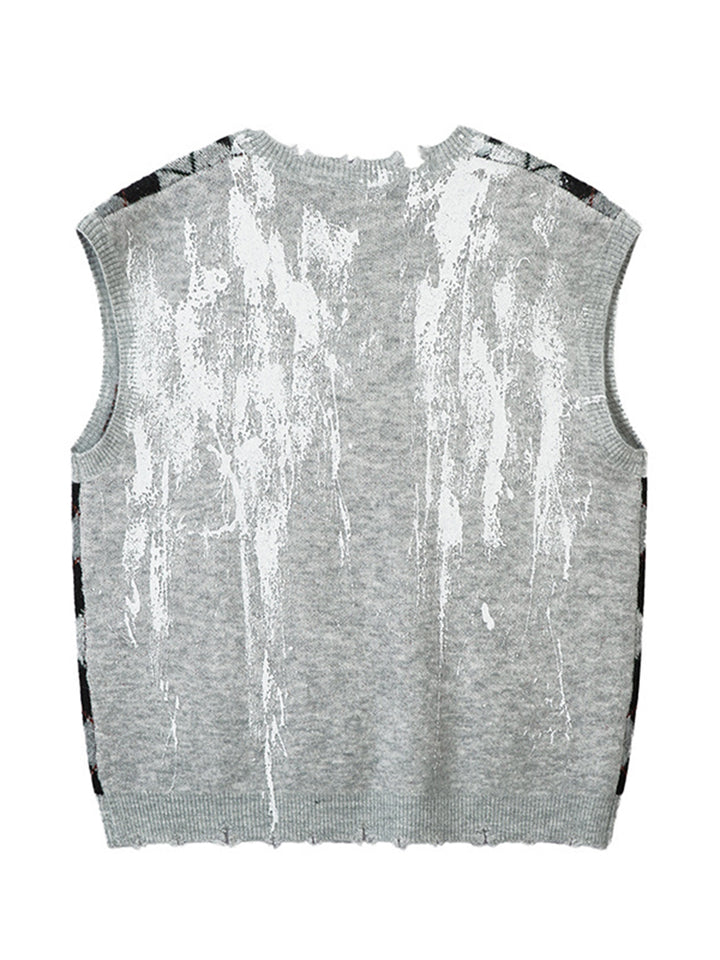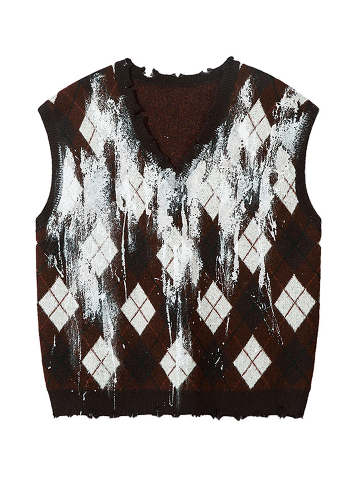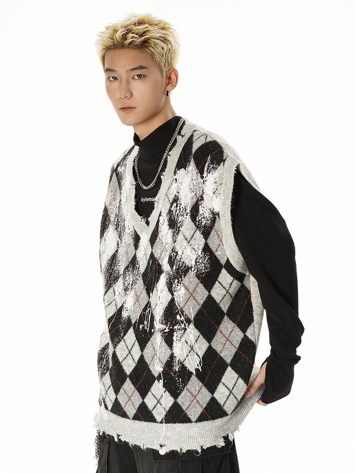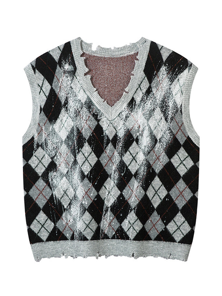 Distressed Argyle Knitted Vest - Casual Sleeveless Pullover Sweaters