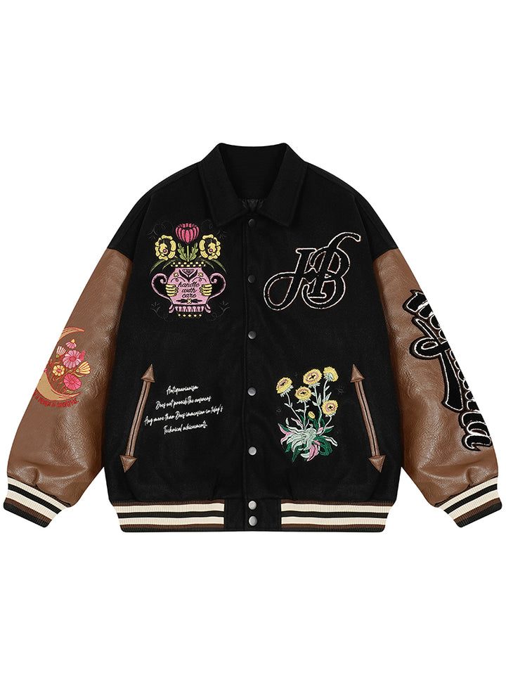 Elevate your streetwear collection with this embroidered varsity jacket, combining bold floral patterns and creative graphic details. The patchwork sleeves in contrasting tones bring a vintage-meets-modern vibe, while the relaxed oversized fit ensures all-day comfort. Perfect for casual outings, layering with hoodies, or styling with jeans, this jacket offers both fashion and function. Made from durable, breathable fabric, it’s designed to keep you comfortable through the seasons. A versatile piece that makes a thoughtful gift for anyone who enjoys expressive and artistic street style.