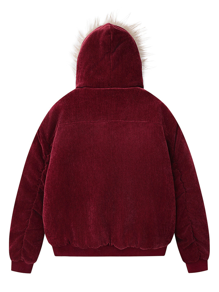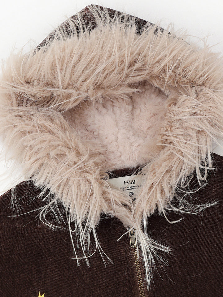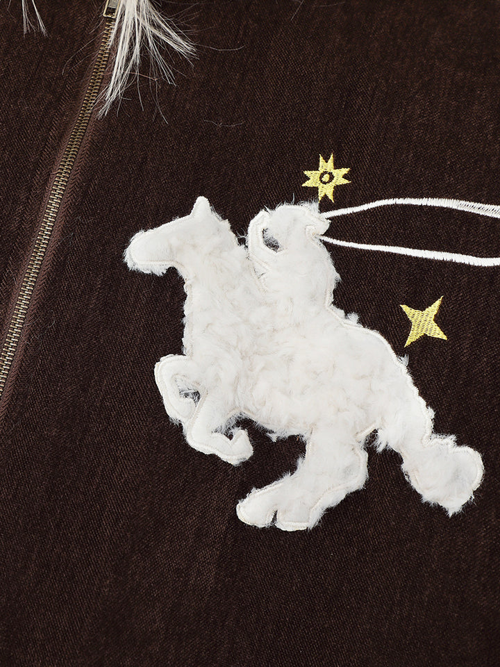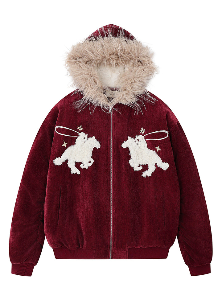 Refresh your winter wardrobe with this stylish hooded jacket that blends warmth and comfort with creative design. Made from a high-quality fabric blend of 95% polyester and 5% spandex, it delivers a soft, durable feel with a hint of stretch for better comfort. The embroidered horse and star motifs add an artistic touch, while the faux fur hood provides extra warmth against the cold. With its relaxed fit and premium velvet texture, this jacket is perfect for daily wear, streetwear styling, or gifting to someone special during the winter season.