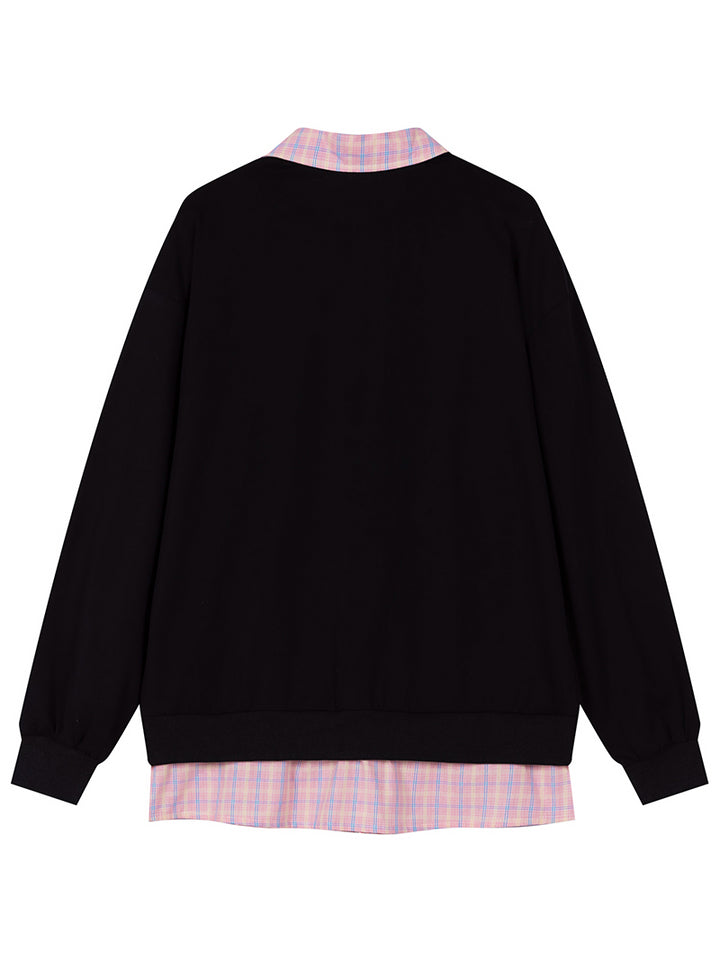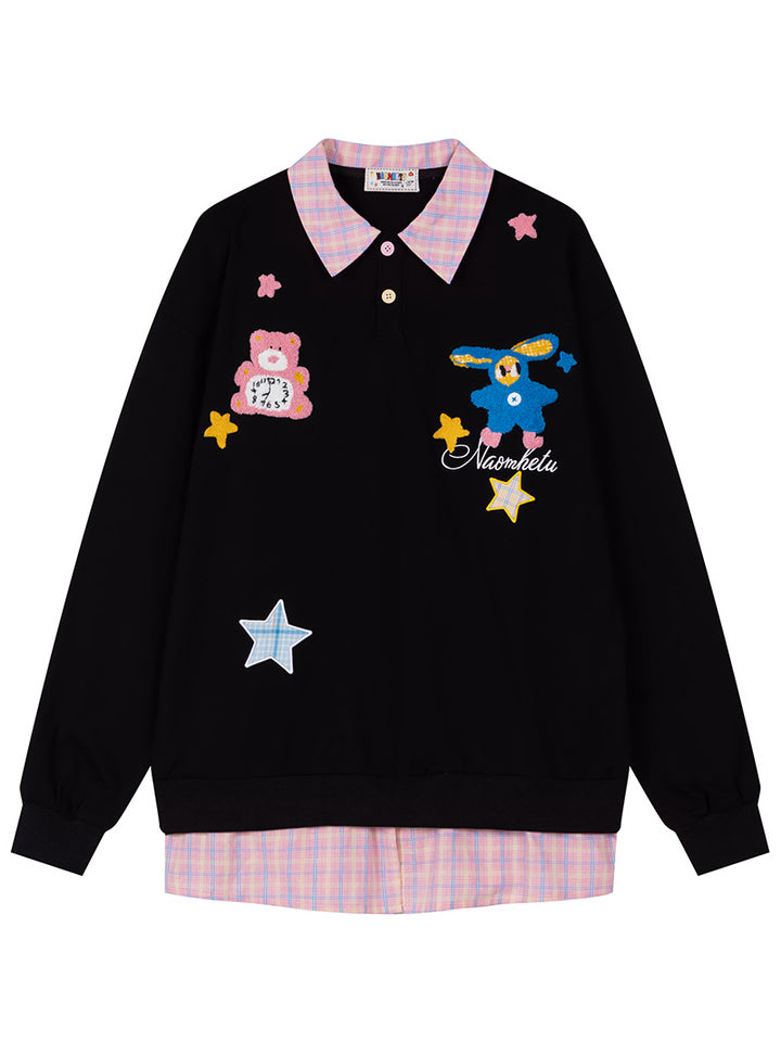 Elevate your everyday style with this adorable long sleeve T-shirt featuring embroidered cartoon characters and a contrasting plaid collar. The relaxed, oversized fit makes it easy to style for a cute and cozy look—whether you're heading out or lounging at home. Made from 100% cotton, this tee is soft, breathable, and perfect for year-round wear. The playful design blends classic and kawaii fashion elements, making it a great gift for fans of unique, creative streetwear. Available in two colors: black and grey blue, and in sizes S through XL.