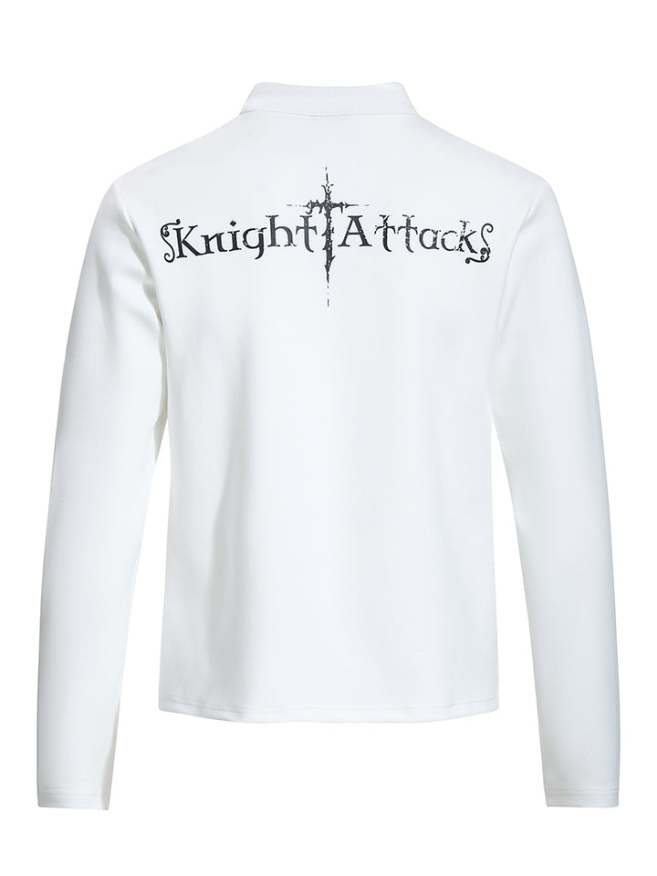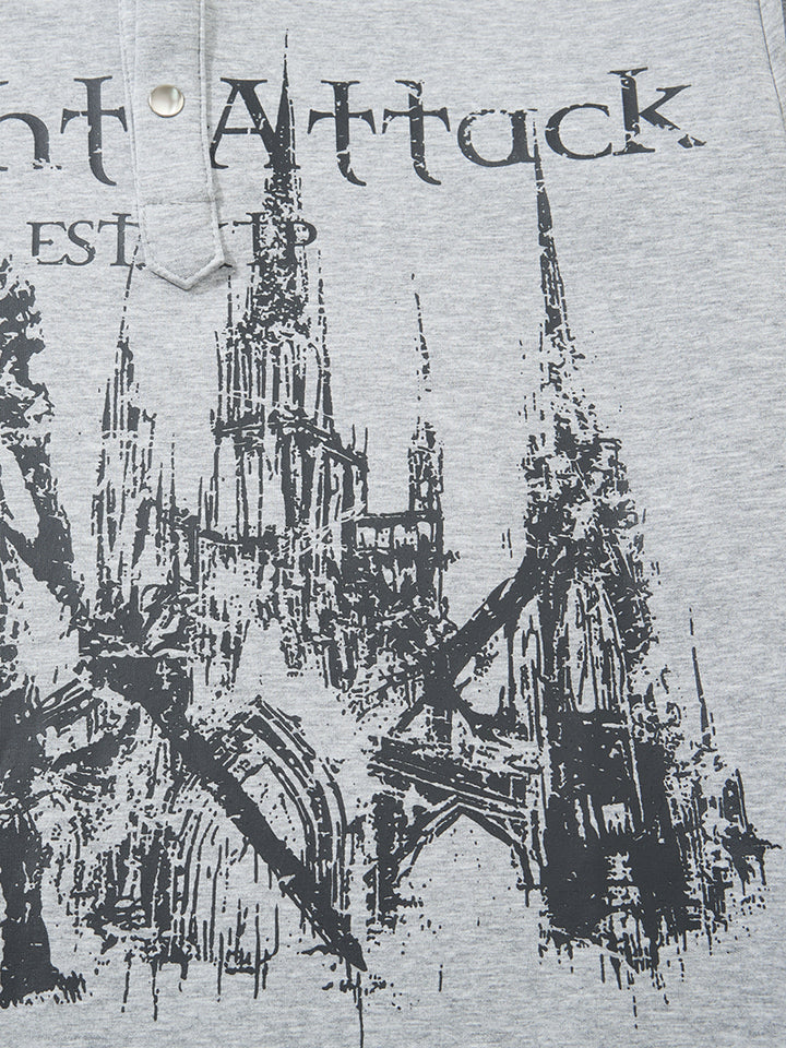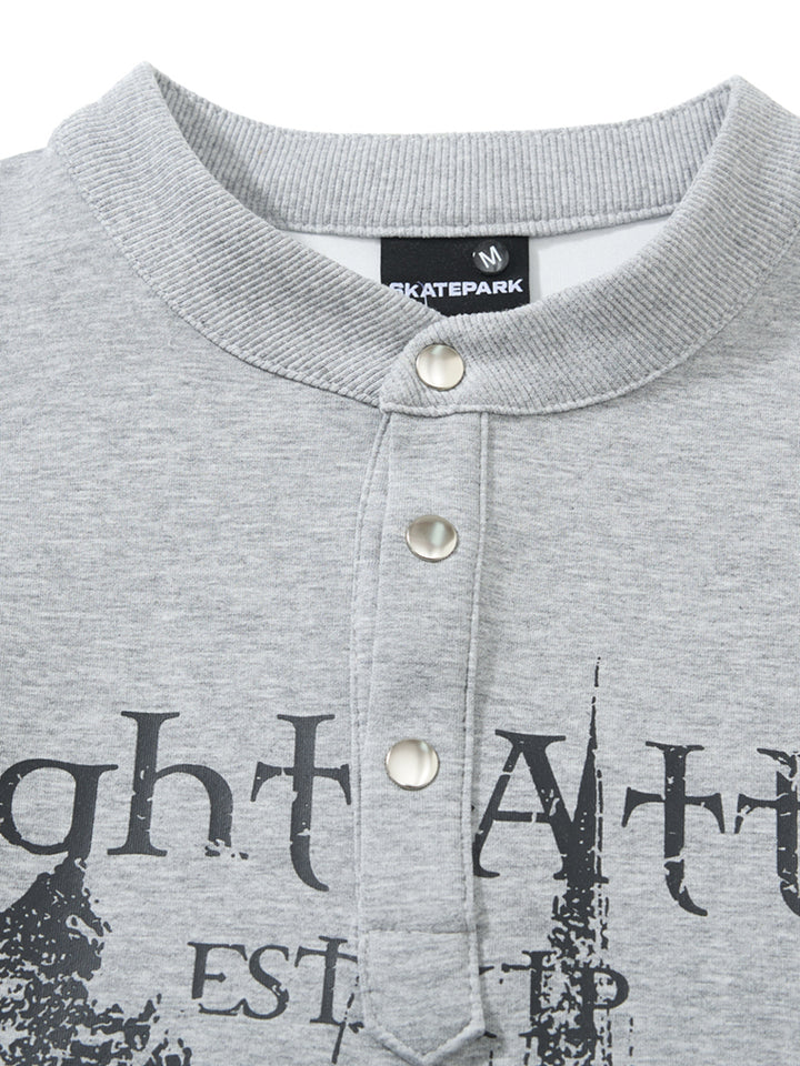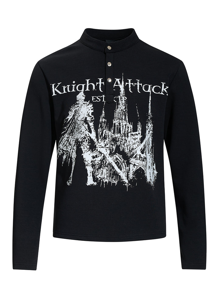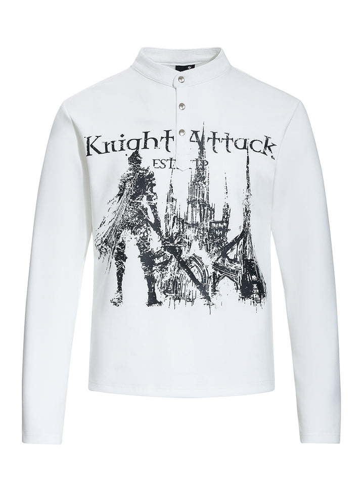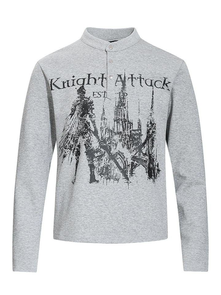 Step into a world of style and fantasy with this long sleeve T-shirt featuring a powerful knight and cathedral-inspired backdrop. Designed with a modern stand collar and a snap-button neckline, it blends medieval energy with urban streetwear attitude. Crafted from a premium 260g aerobic air layer fabric—consisting of soft cotton, durable polyester, and stretchy spandex—this tee offers all-day comfort and structure. Choose from three versatile colors: Black, Off-White, and Heather Gray. Whether you're heading out or just elevating your daily look, this shirt delivers bold expression with effortless wearability. Available in sizes S to XXL.