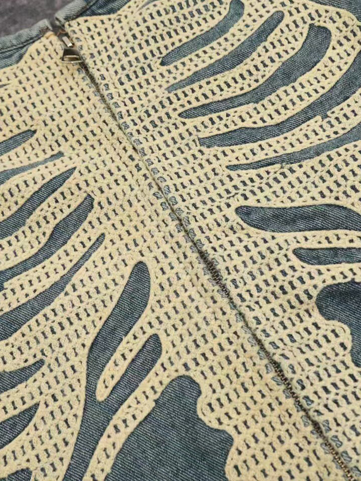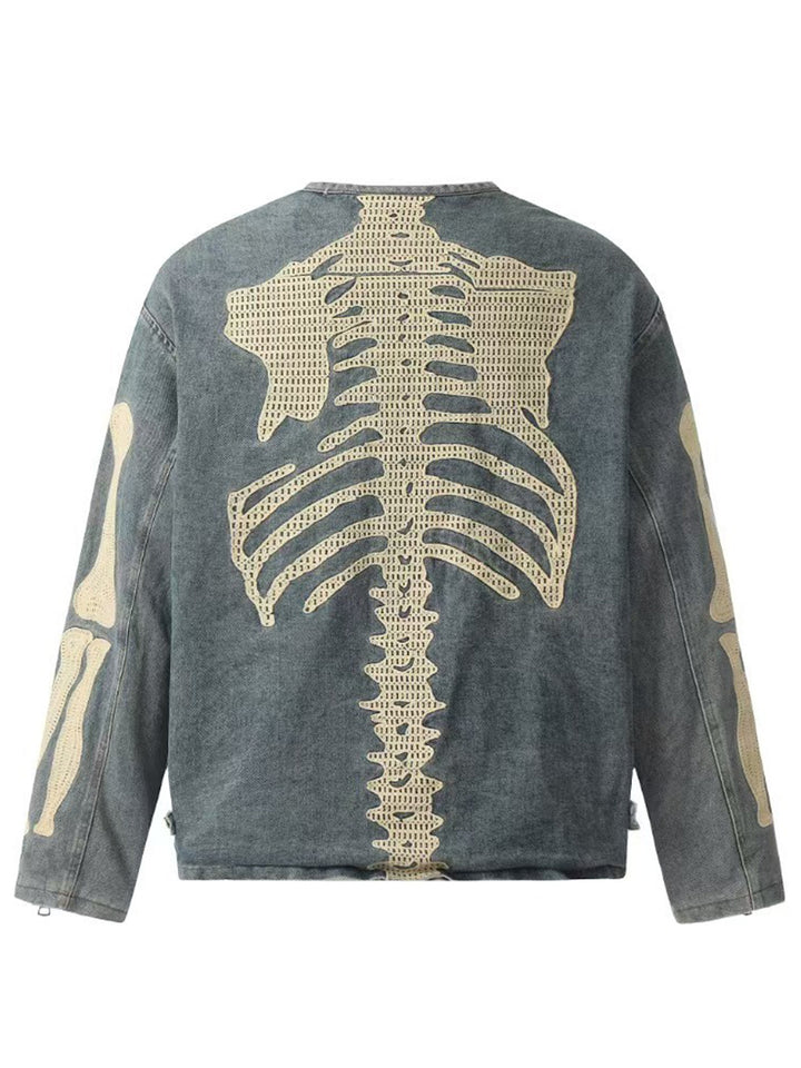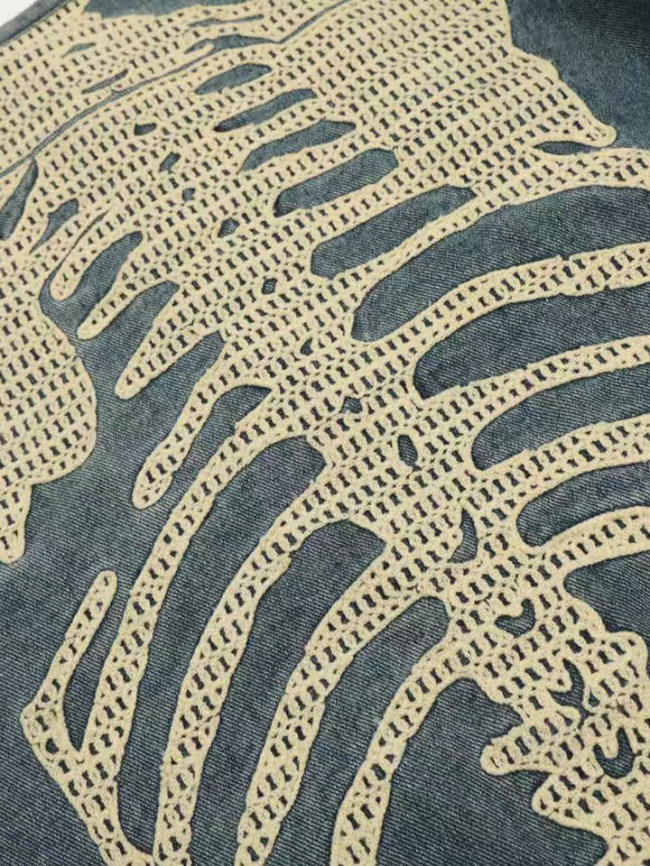 Step up your fashion game with this oversized denim jacket featuring heavy skeleton embroidery for a bold, edgy streetwear statement. The detailed bone design covers the front, back, and sleeves, making it a standout piece in any wardrobe. Crafted from premium washed denim, this jacket combines durability with a vintage-inspired finish. Its relaxed fit allows easy layering over t-shirts and hoodies, perfect for casual outings, parties, or streetwear styling. A versatile outerwear piece that adds individuality and character, making it a must-have for those who enjoy unique fashion with attitude.