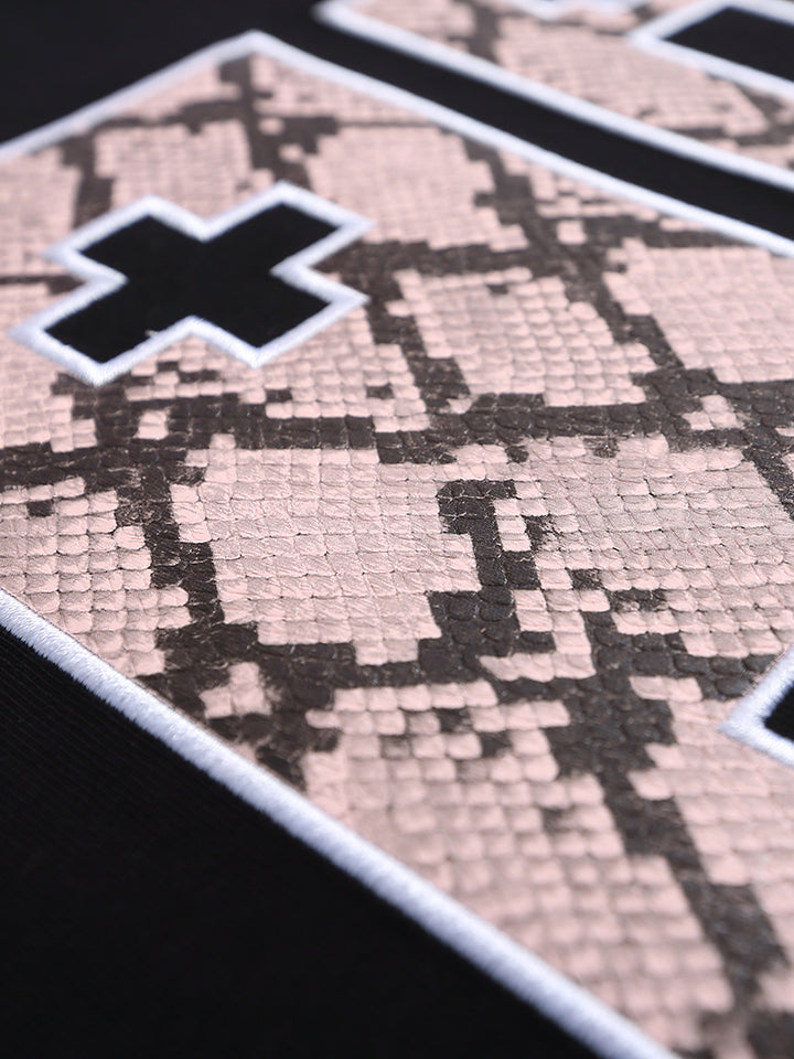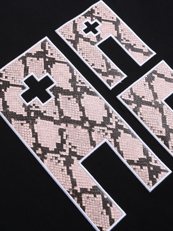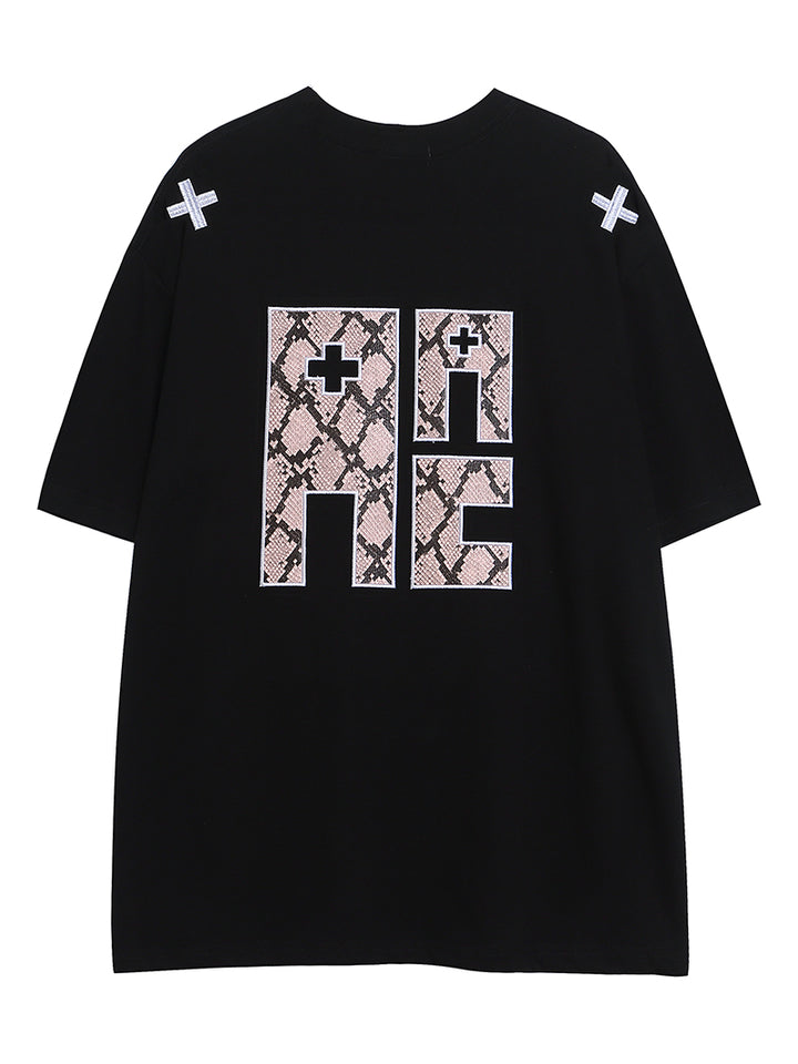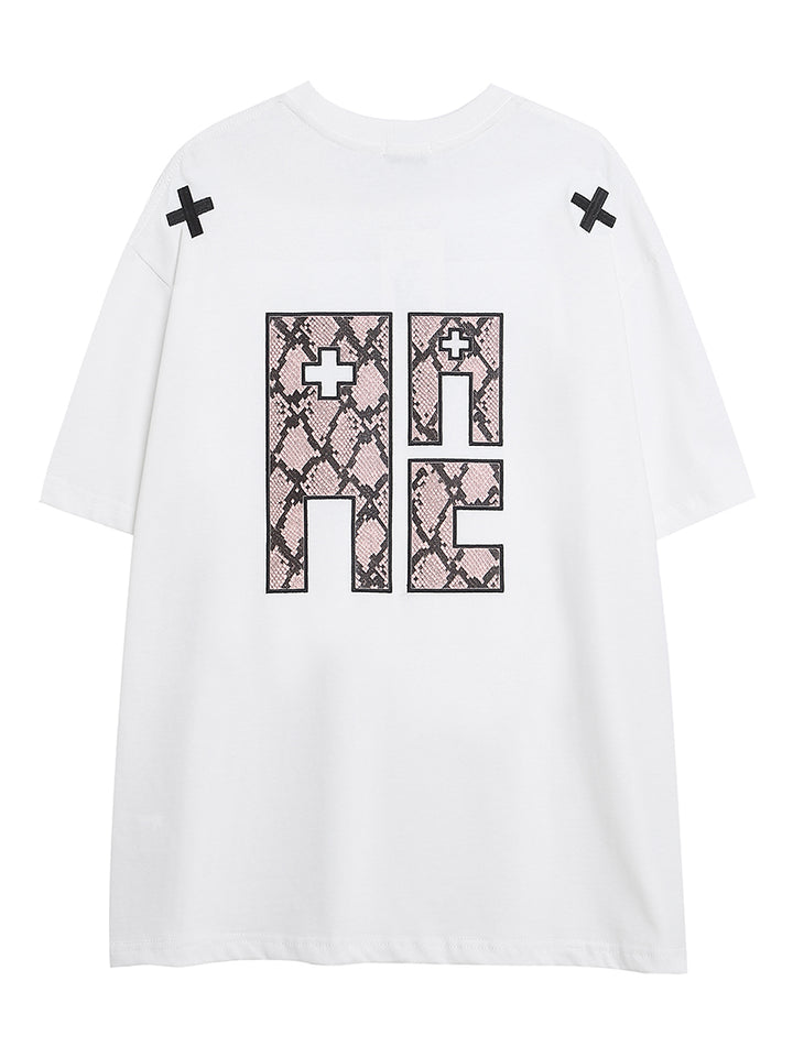 Make a statement with this fashion-forward oversized T-shirt, featuring bold patchwork graphics and minimalist accent details on the shoulders. The snakeskin-inspired print gives it a unique textural edge, perfect for fans of streetwear and contemporary design. Whether worn solo or layered, this tee blends comfort and style effortlessly. Ideal for casual outings, music festivals, or everyday street style looks.