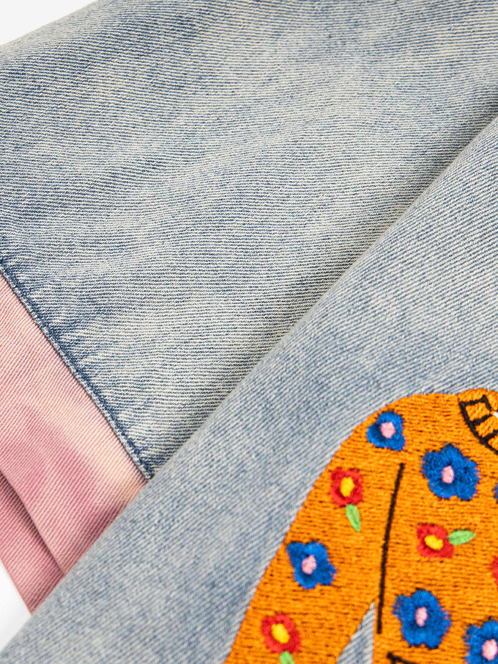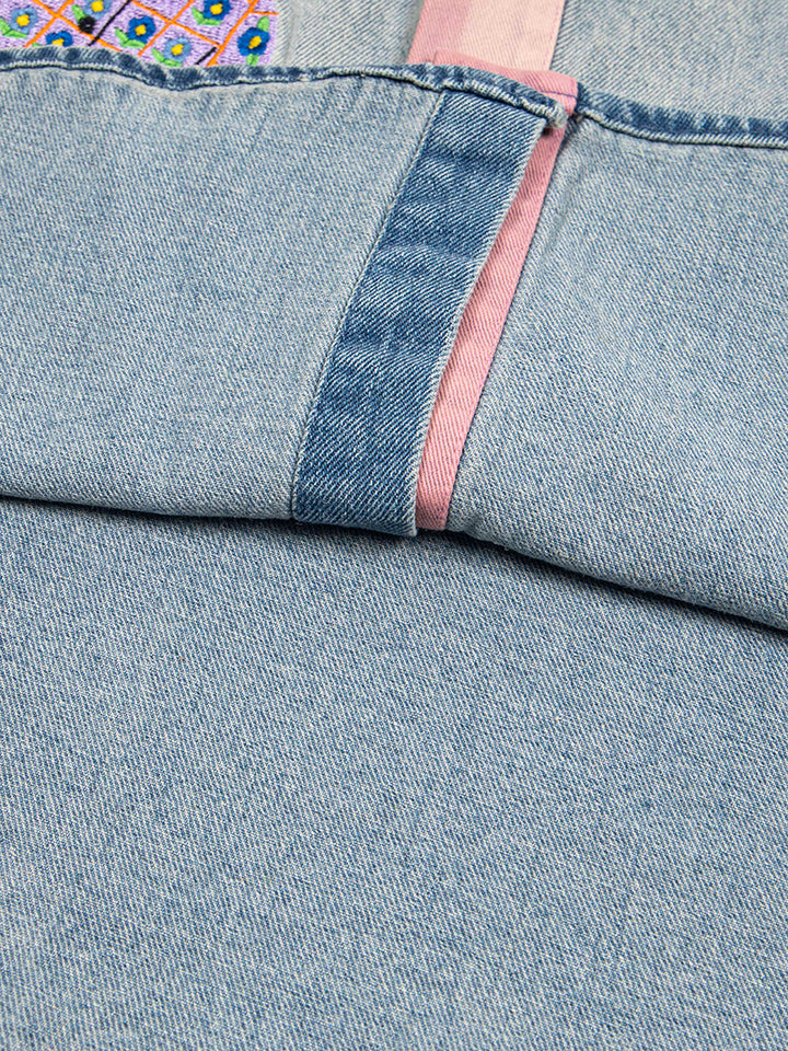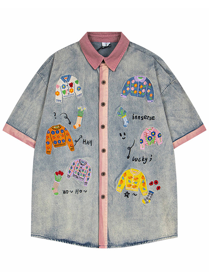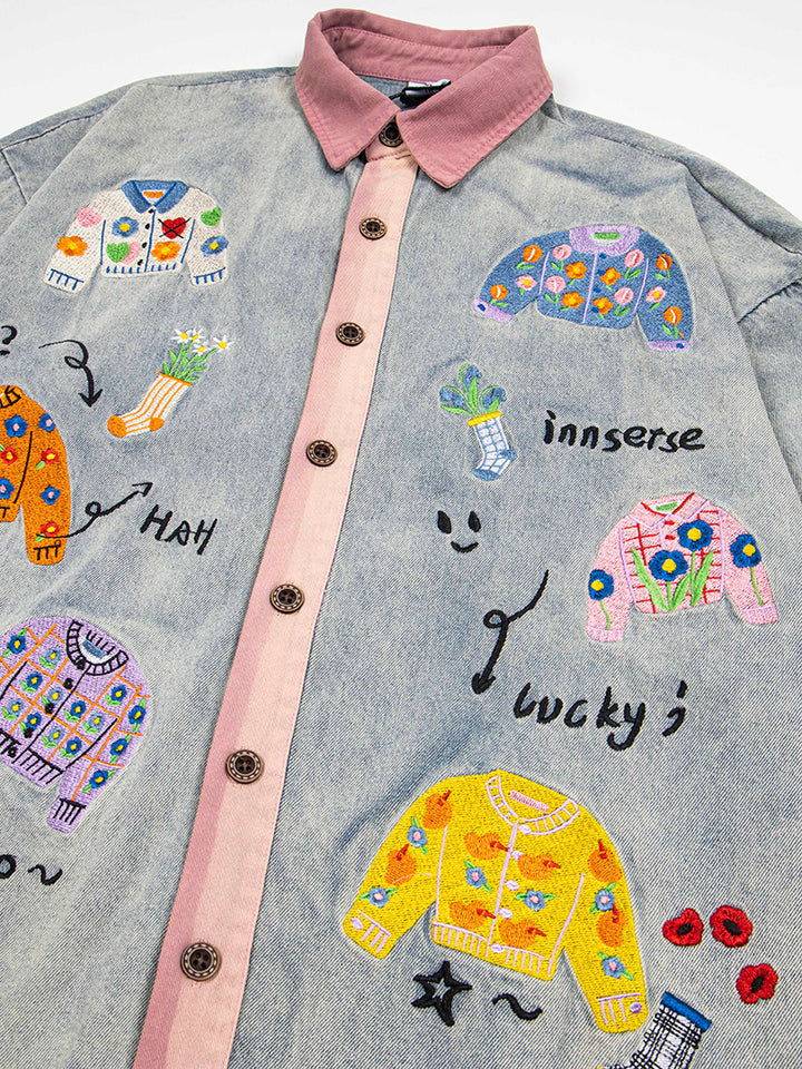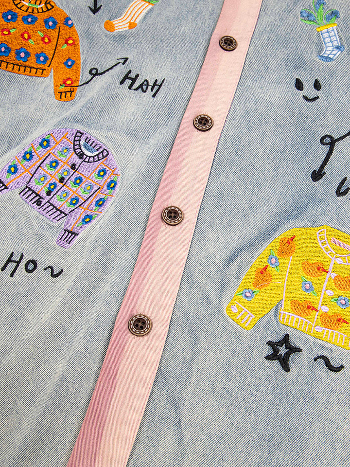 Bring a sense of fun and individuality to your outfit with this standout oversized denim shirt. Crafted from 100% cotton, it offers breathable comfort and a relaxed fit that flatters a wide range of body types. The shirt is adorned with playful embroidered sweater and sock designs, adding a colorful and artistic touch to your casual look. The pink color block collar and sleeve cuffs enhance its vintage charm, making it ideal for streetwear styling, weekend outings, or creative layering. Available in blue and sizes M to XL, this piece is a must-have for anyone who loves unique, expressive fashion.