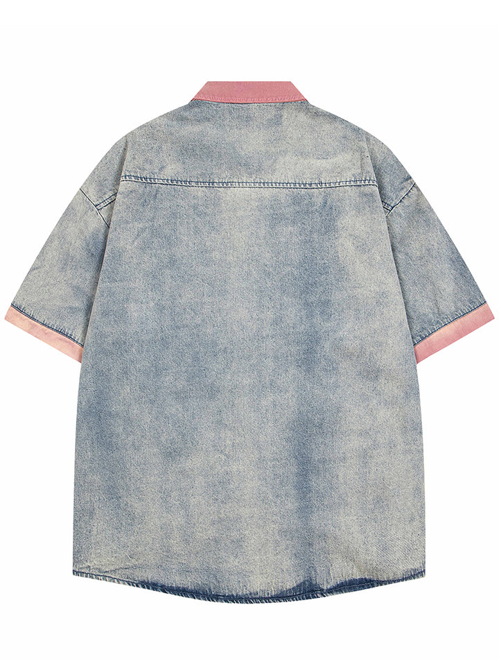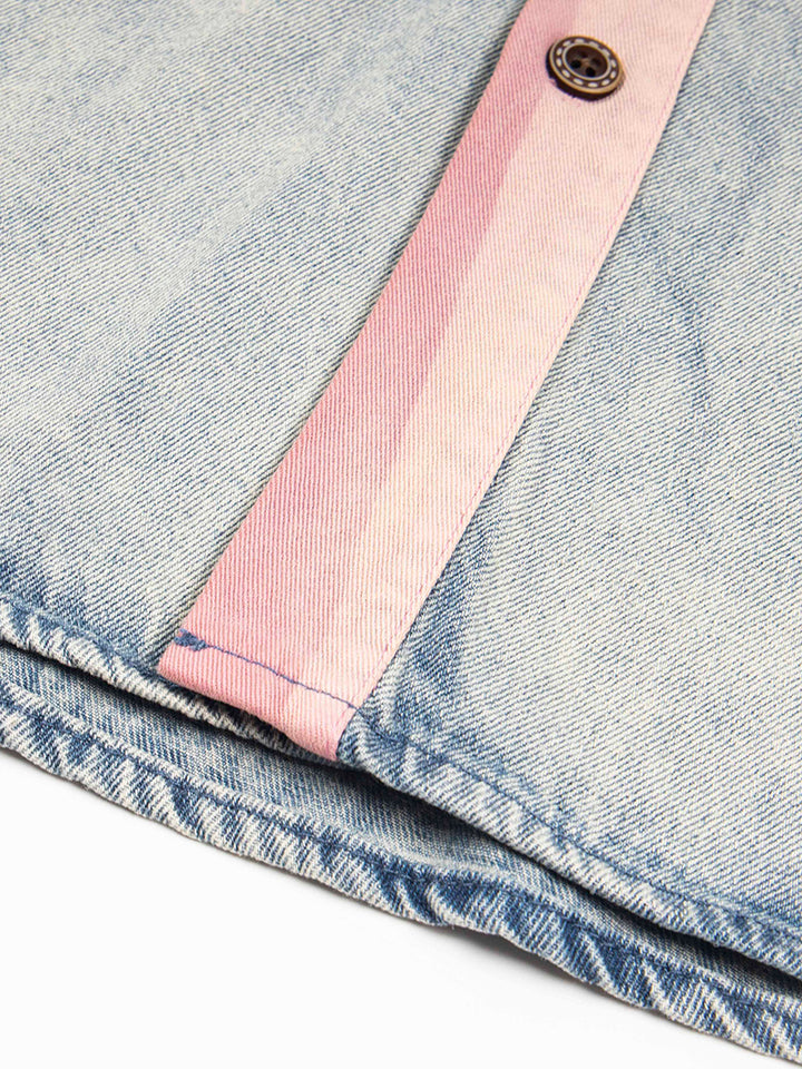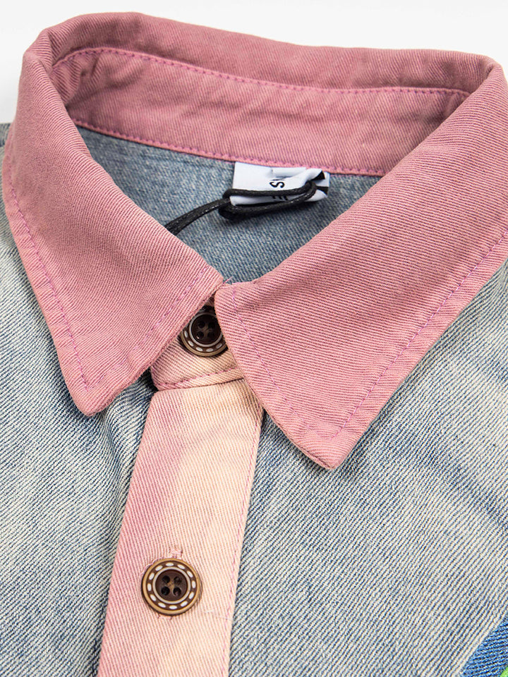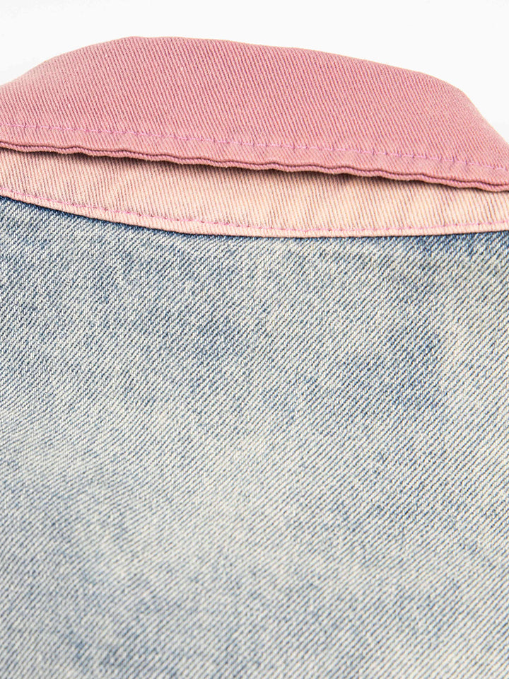 🎨 Color Block Accents – Contrasting pink collar and placket add visual interest to the classic blue denim.