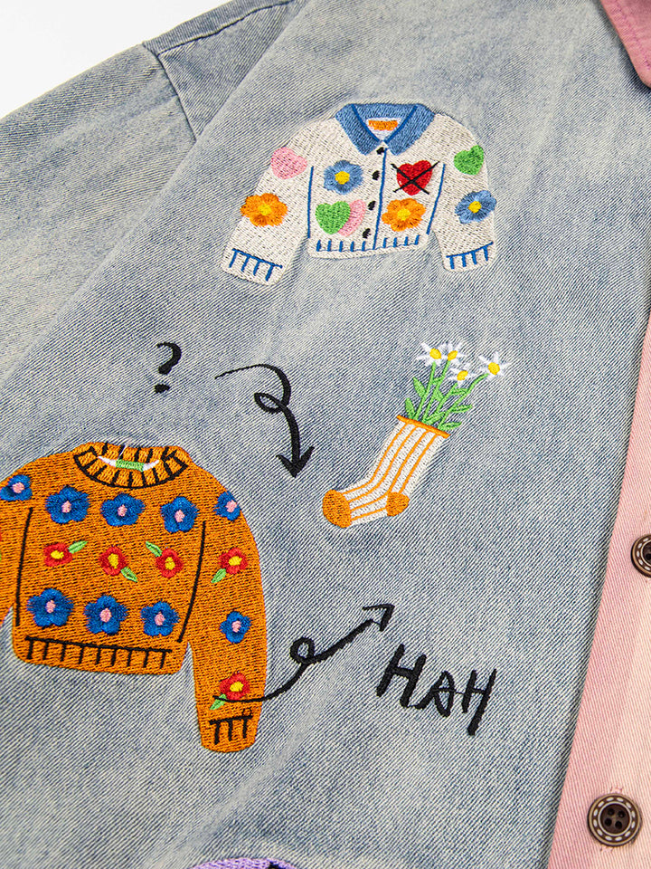 🧵 Whimsical Embroidered Graphics – Features fun, hand-drawn-style sweaters and socks for a creative, artsy look.