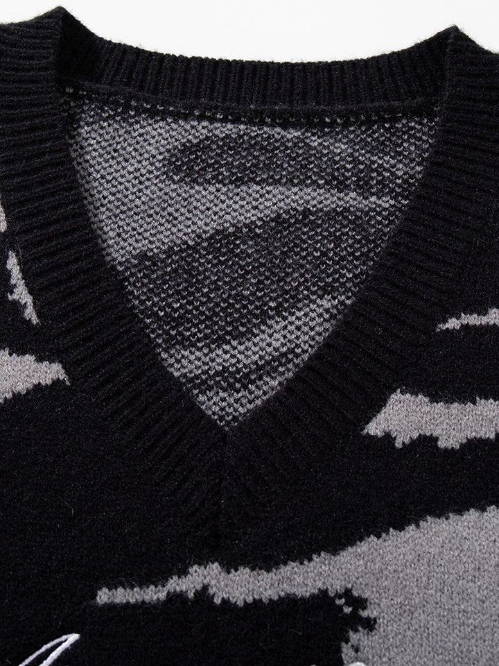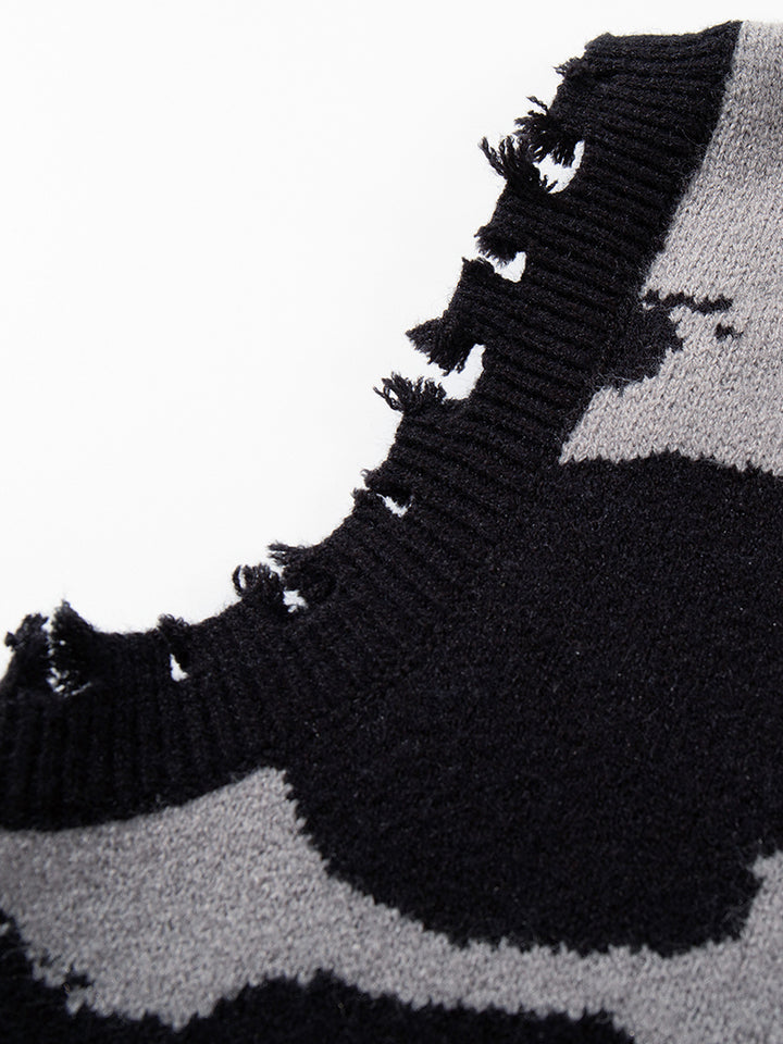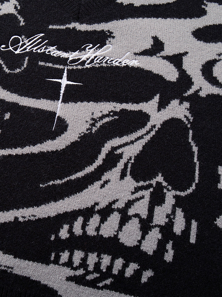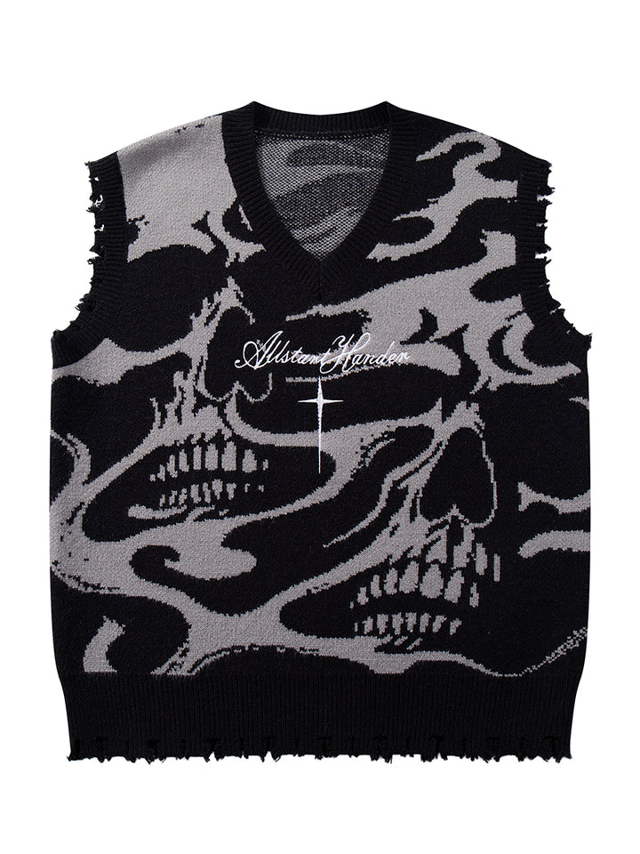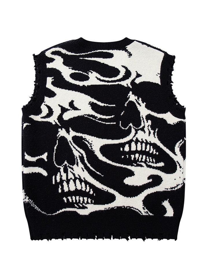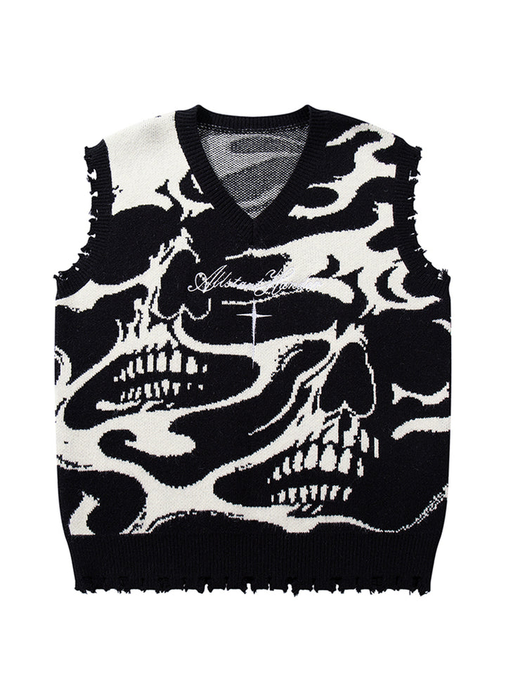 Add a bold edge to your wardrobe with this skull-pattern knitted sweater vest, designed to stand out with its striking flame and skull motif. The sleeveless cut with distressed detailing at the edges delivers a raw, street-ready aesthetic, while the soft knit fabric ensures comfort and wearability. Perfect for layering over casual tees or pairing with your favorite streetwear essentials, this vest combines comfort with attitude. A must-have piece for anyone who enjoys edgy, statement-making fashion.