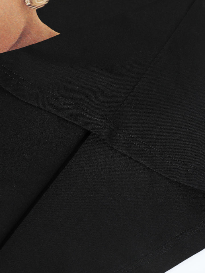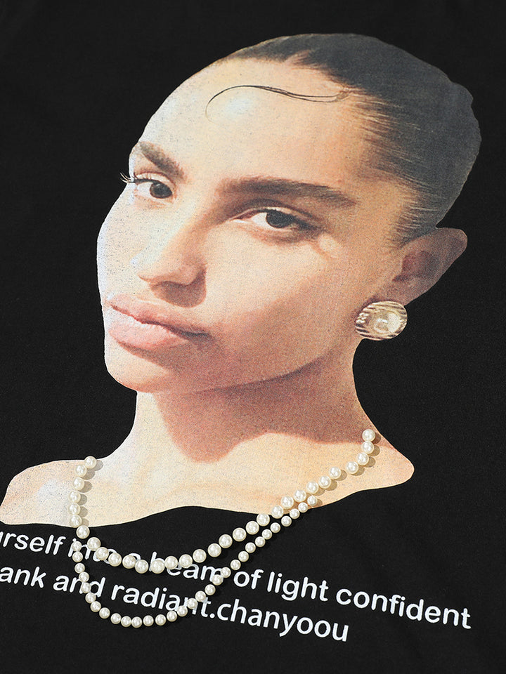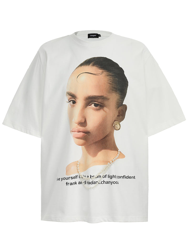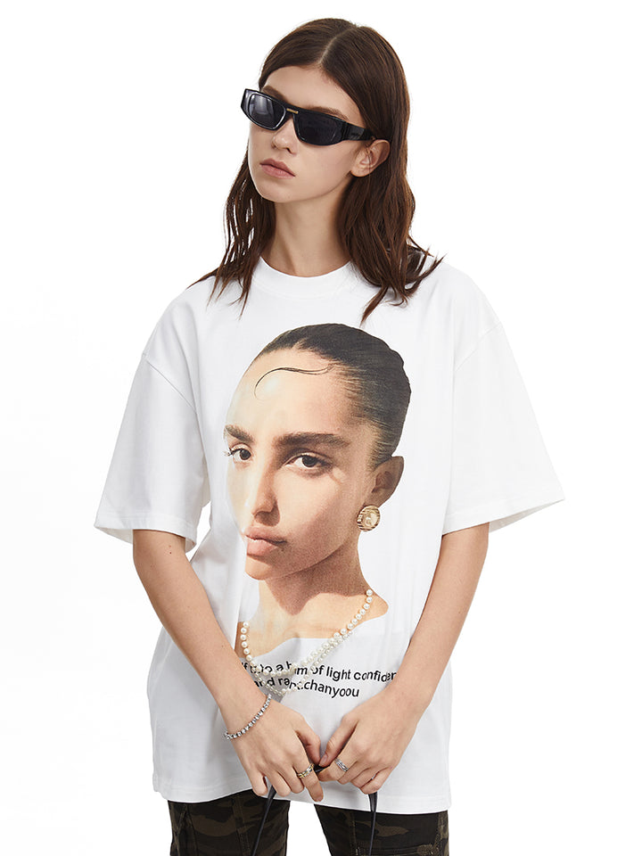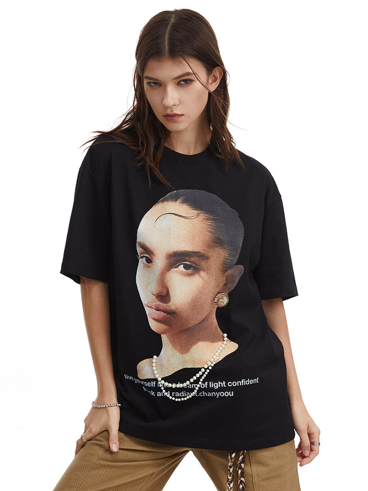 Step into bold self-expression with this oversized graphic tee, blending fashion and art into a wearable masterpiece. The vivid printed portrait is complemented by a 3D pearl necklace effect, adding texture and elegance. Designed for comfort and individuality, this t-shirt is perfect for fashion-forward individuals who aren't afraid to stand out.