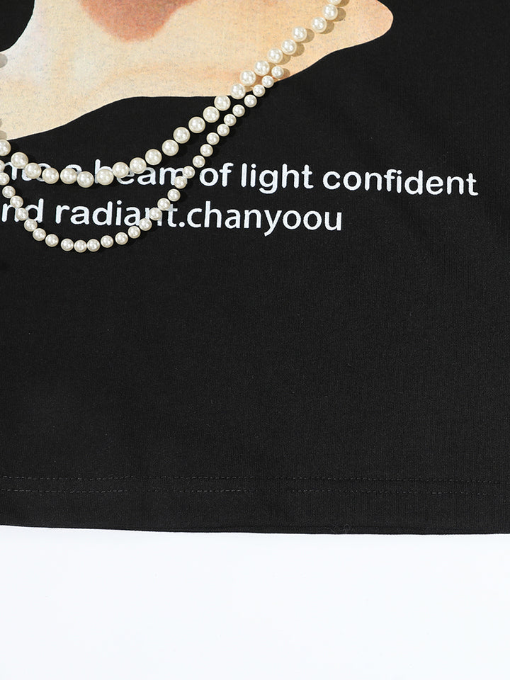 💎 Unique Artistic Design – Features a bold and modern printed portrait with a realistic pearl necklace detail for a high-fashion streetwear look.