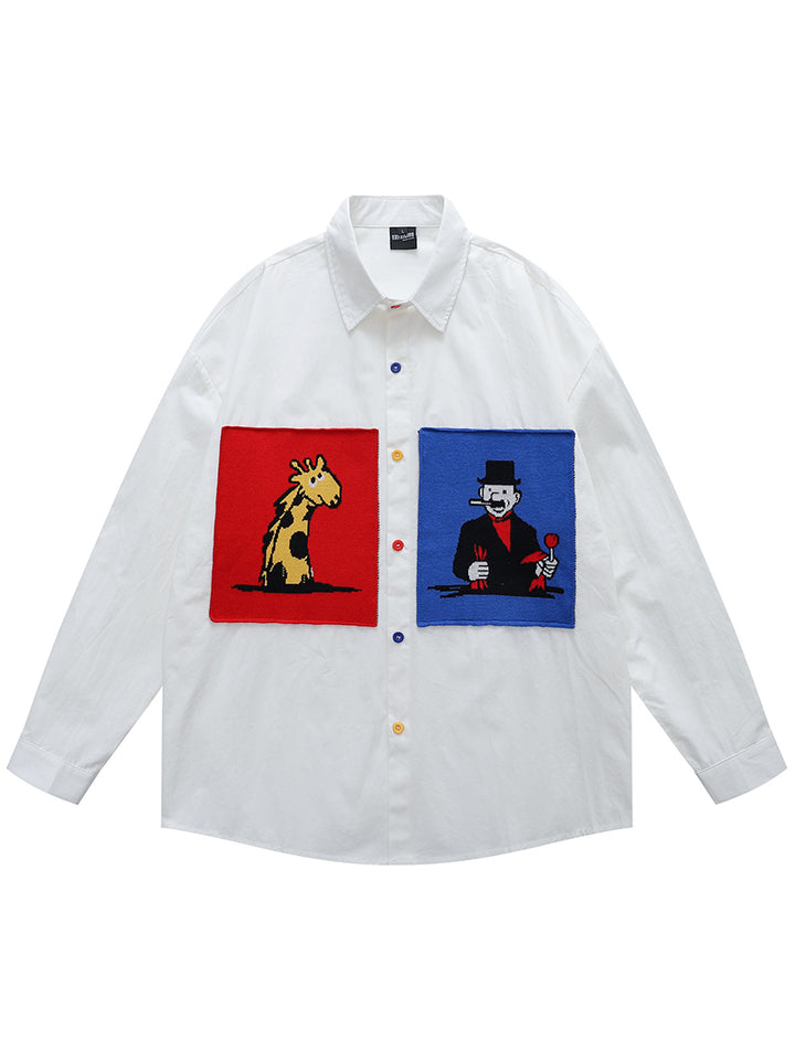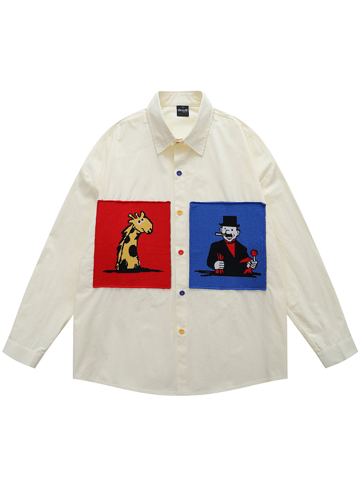 Refresh your casual wardrobe with this creative long-sleeve shirt, crafted from 100% breathable cotton for maximum comfort. The oversized relaxed fit provides a modern streetwear aesthetic, while the colorful patchwork panels with cartoon-style graphics add personality and charm. Available in three versatile colors—Blue, Apricot, and White—and sizes M, L, and XL, this button-down shirt pairs effortlessly with jeans, trousers, or layered looks. Whether for daily wear, casual outings, or as a unique gift, it’s a stylish addition to any fashion-forward collection.