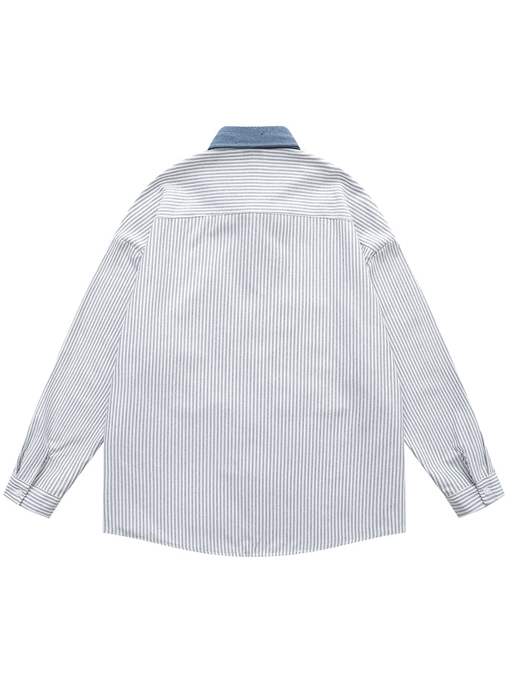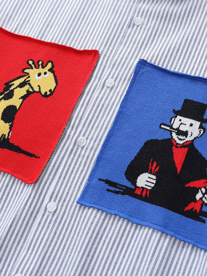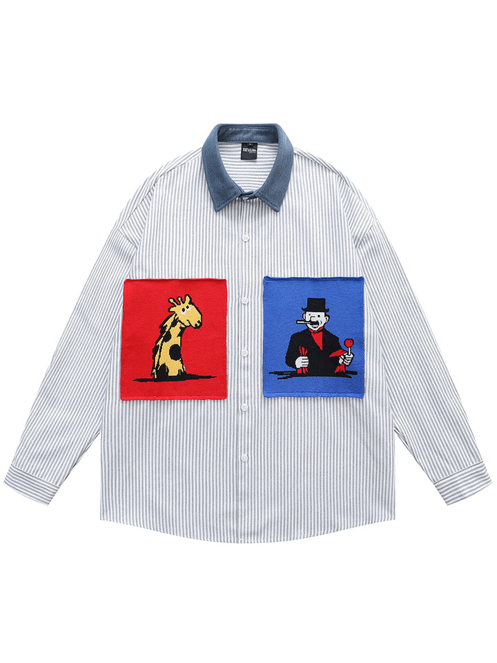 Elevate your casual wardrobe with this oversized striped shirt, blending classic tailoring with modern streetwear creativity. The shirt features playful cartoon patchwork graphics on the chest and a contrast denim-style collar, making it a bold and eye-catching piece. Available in Blue and Black, and in sizes M, L, XL, this shirt is crafted from a 65% cotton and 35% polyester blend, offering breathable comfort and lasting durability. Its relaxed oversized fit ensures ease of movement, while the stripe pattern adds a timeless touch. Perfect for daily wear, casual outings, or as a thoughtful gift, this shirt is a must-have addition to any creative wardrobe.