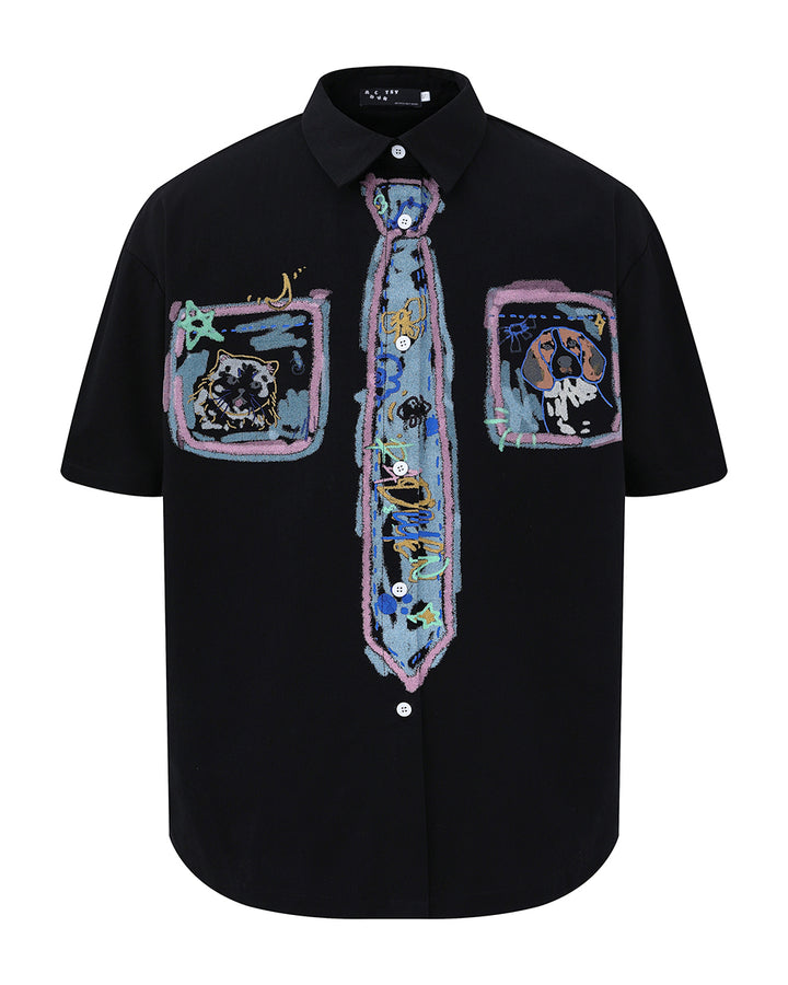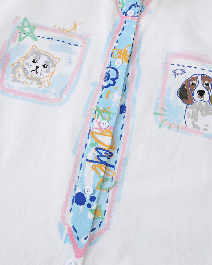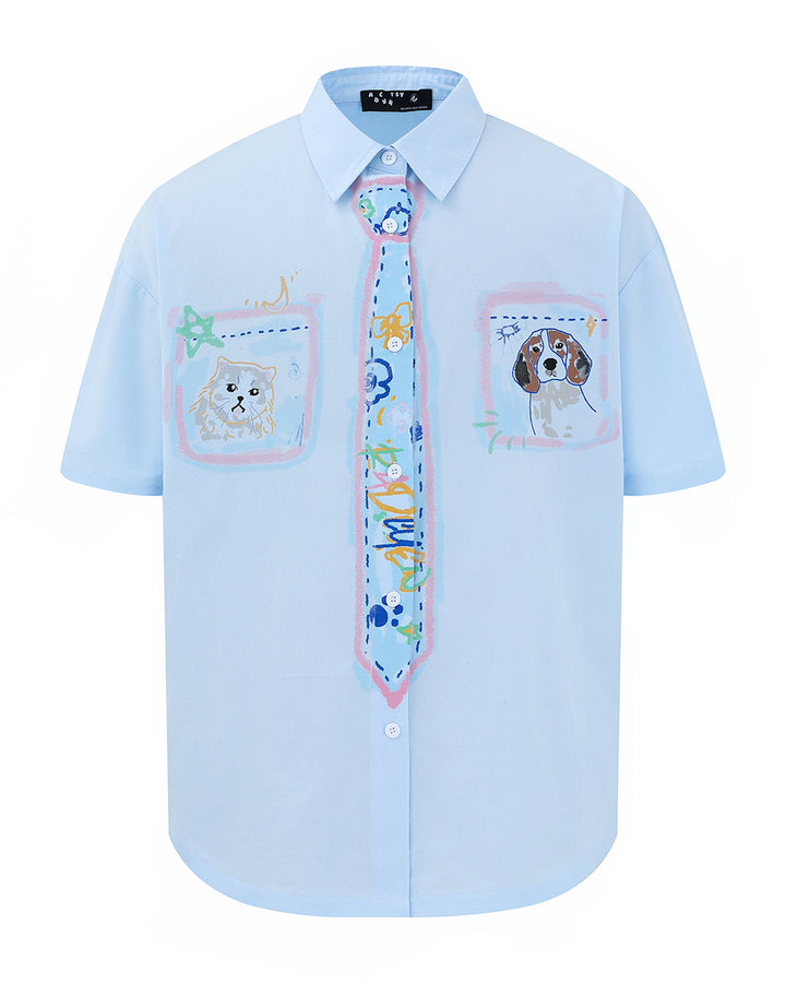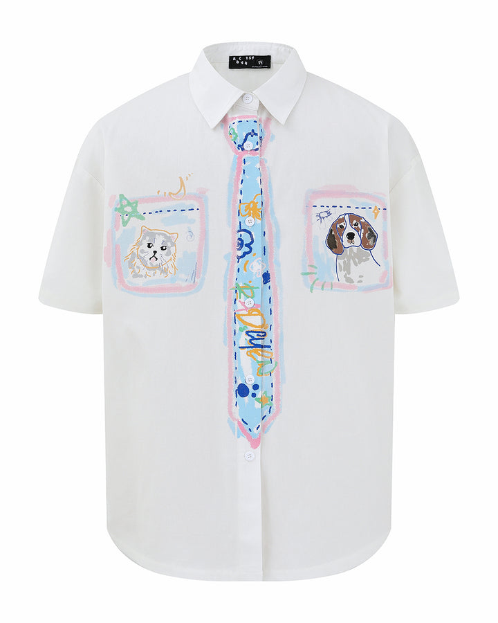 Elevate your everyday style with this standout men’s short sleeve shirt, featuring a unique mix of hand-drawn cat and dog prints along with a quirky faux necktie design. Made from 100% breathable cotton, it ensures comfort all day long while adding artistic personality to your look. The relaxed oversized cut provides a trendy fit that’s perfect for daily wear, lounging, or styling with streetwear layers. Available in white, blue, and black, this shirt is a great gift idea or a fresh addition to your creative wardrobe.