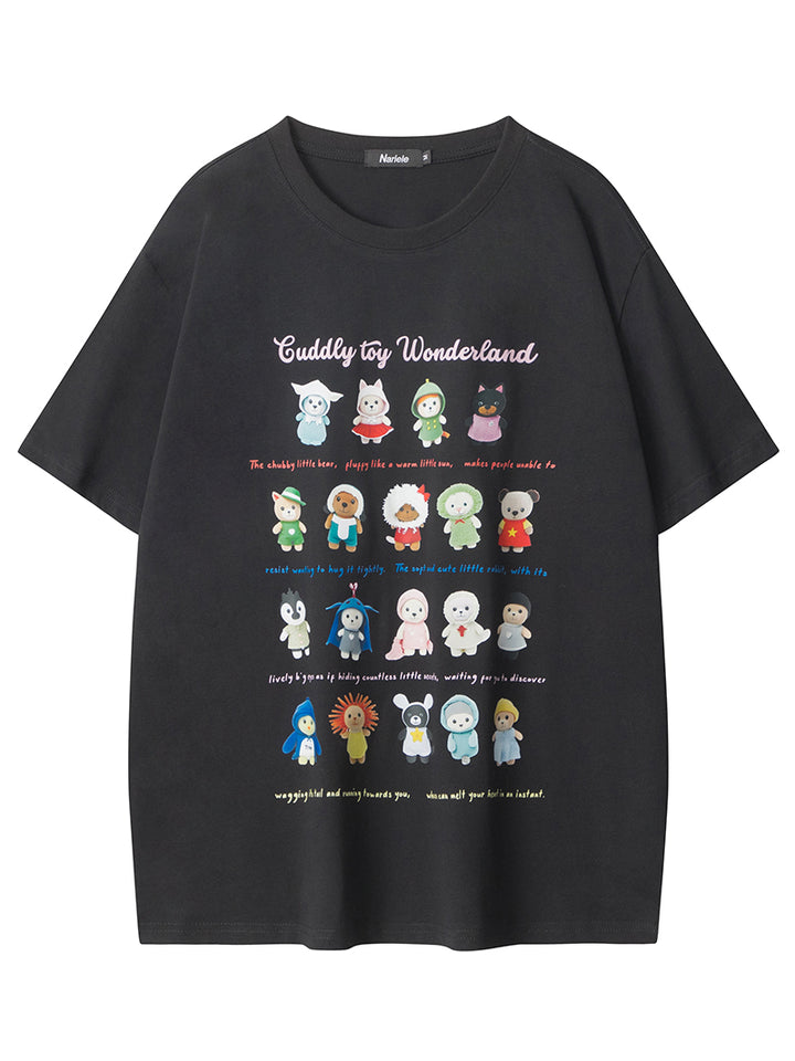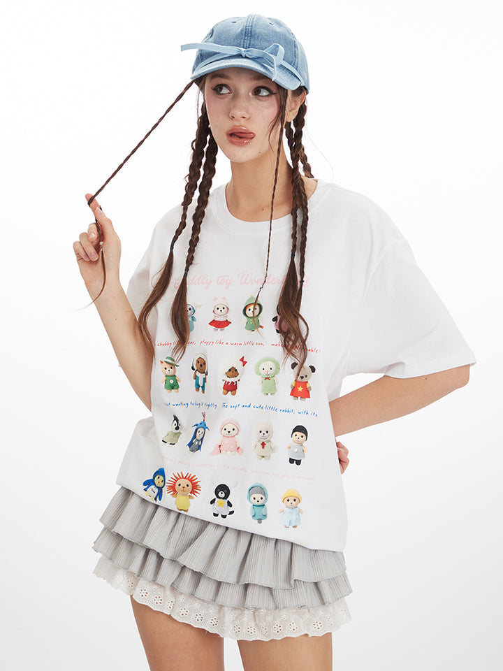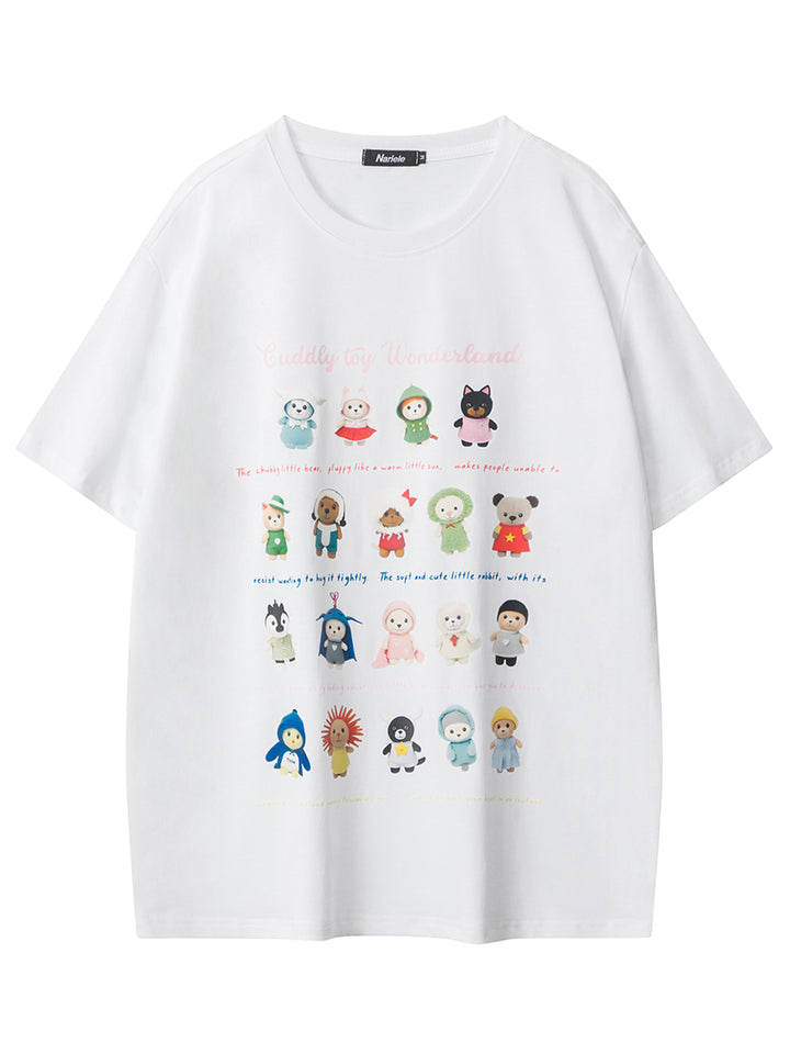 Add a playful touch to your wardrobe with our printed t-shirt! Featuring an adorable array of cute, chubby little plush animals in bright, cheerful colors, this tee is perfect for those who love fun, whimsical designs.