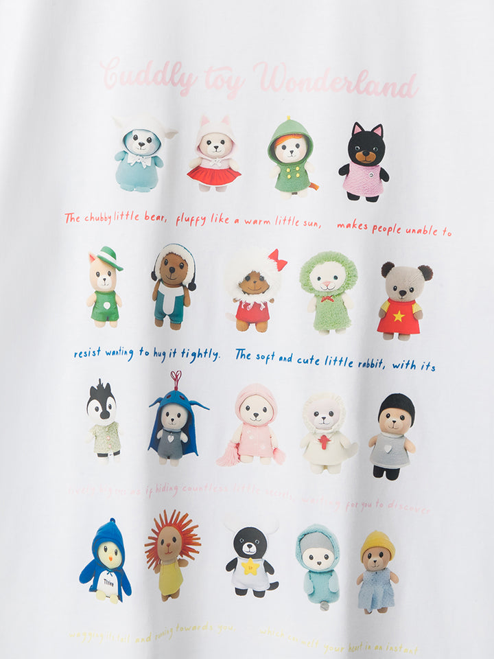 - Cute Design: The front of the shirt showcases a variety of colorful animal plushes, each with their own personality, creating a charming, cozy vibe. The designs feature soft textures and bright accents that bring joy to any outfit.