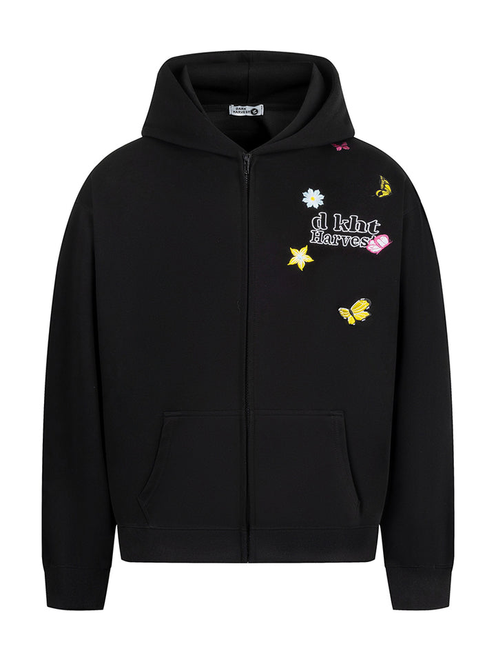 Elevate your streetwear collection with this standout zip-up hoodie, available in classic black and heather gray. Featuring whimsical embroidered butterflies and flowers, this hoodie brings a playful and artistic touch to any casual look. Crafted from a high-quality cotton-polyester blend and fully lined with 100% polyester, it offers a soft feel and reliable warmth for year-round comfort. With a relaxed fit, full-zip closure, and roomy hood, this piece is perfect for layering or wearing on its own. Ideal for fashion enthusiasts looking to express their individuality with style and comfort.