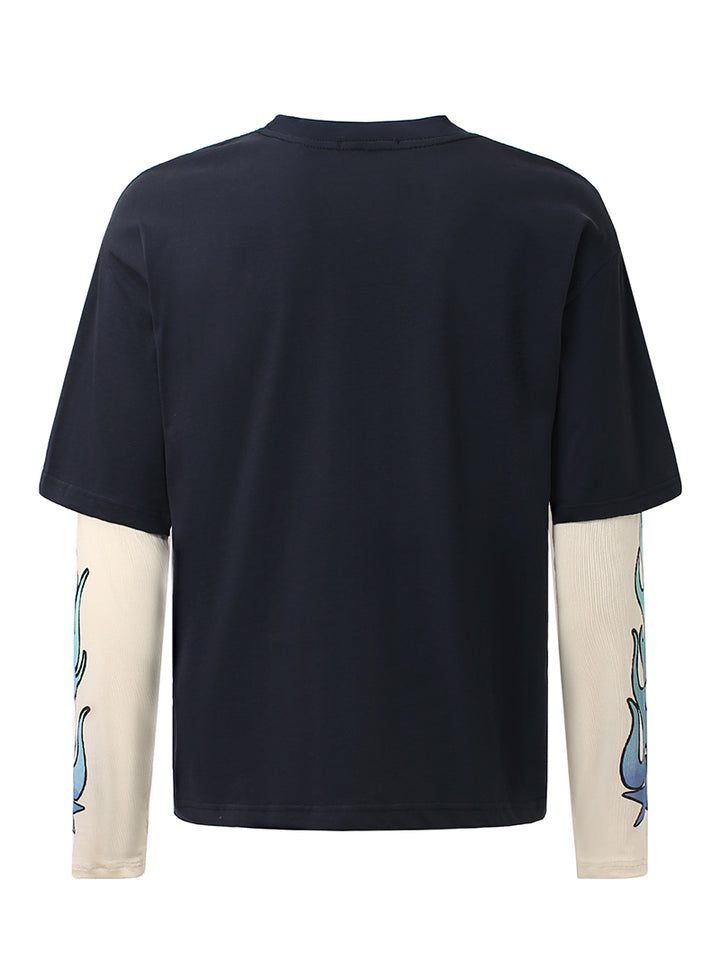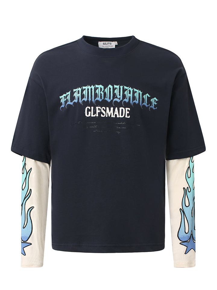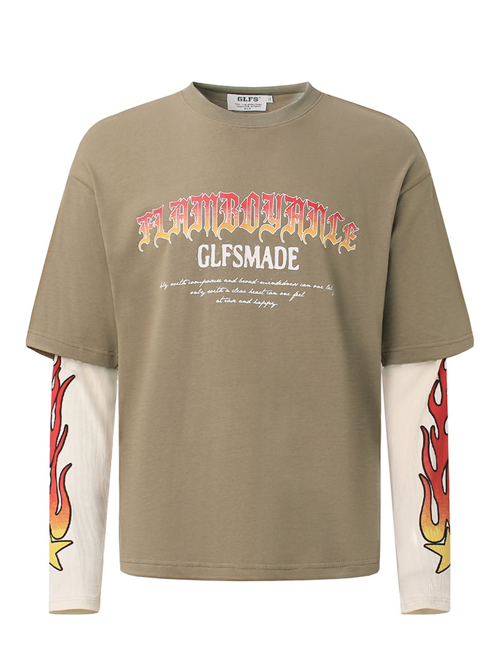 Take your streetwear game up a notch with this uniquely bold and comfortable flame-sleeve T-shirt. Made from a 280g heavyweight double-yarn combed cotton, it offers both premium feel and reliable structure. The layered-look ribbed sleeves are crafted from a smooth, stretch fabric that ensures comfort without compromising shape. Designed with a Sorona® ribbed neckline, this tee maintains a crisp look wear after wear. The environmentally friendly distressed graphic adds a retro edge, making this a standout piece for casual or styled streetwear looks. Available in black, khaki, and cobalt blue with relaxed sizing from M to XL.