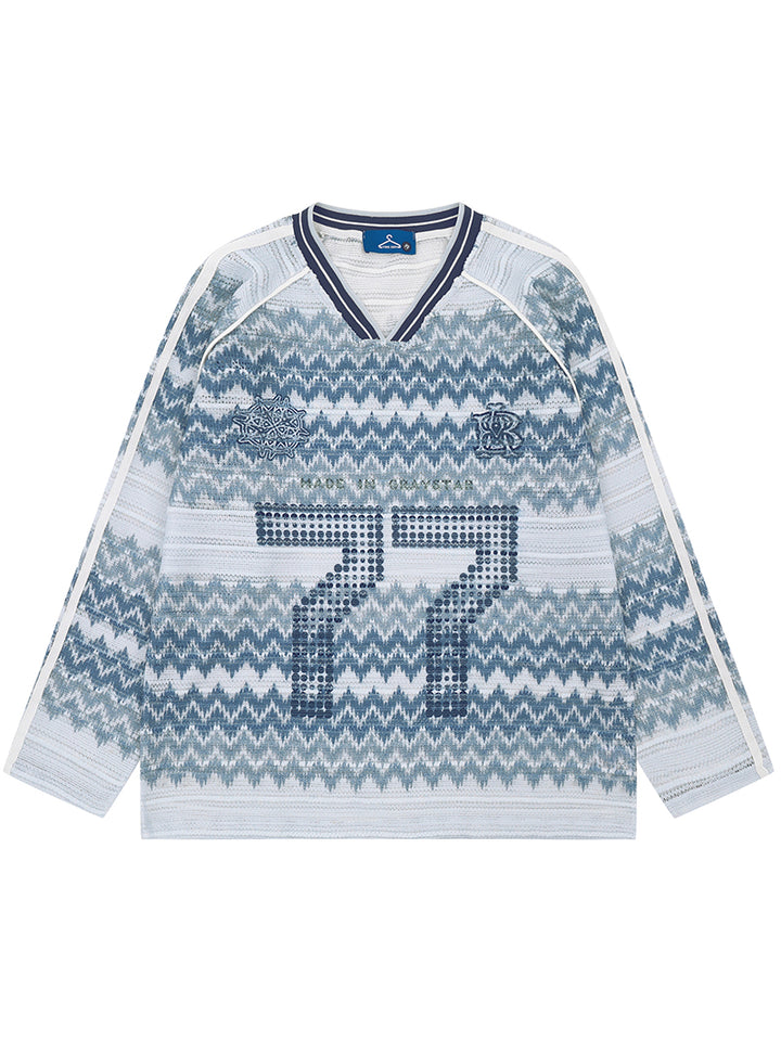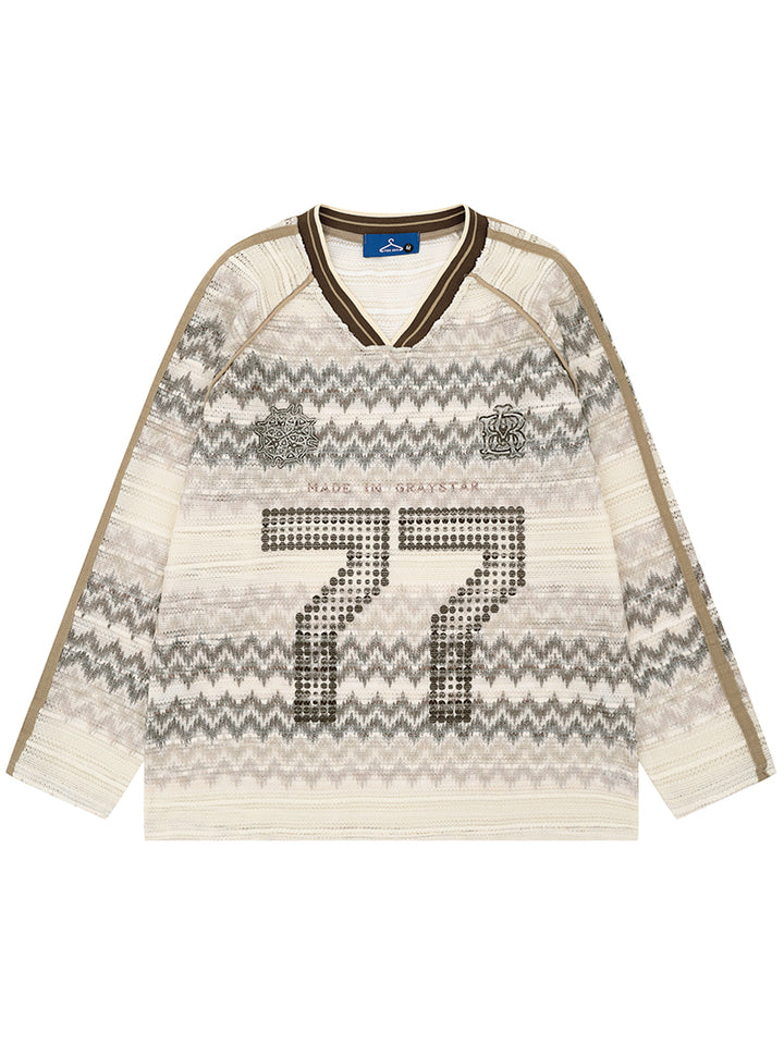 Stand out in this unique long sleeve T-shirt that blends vintage athletic style with modern streetwear flair. The eye-catching hollow-out "77" front graphic and retro zigzag pattern create a dynamic textured look, while the relaxed fit makes it ideal for both casual wear and fashion-forward styling. Crafted from soft, breathable fabric, this top offers comfort without compromising style. A perfect piece for trendsetters who appreciate bold, creative design with a nostalgic twist.