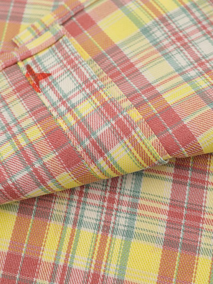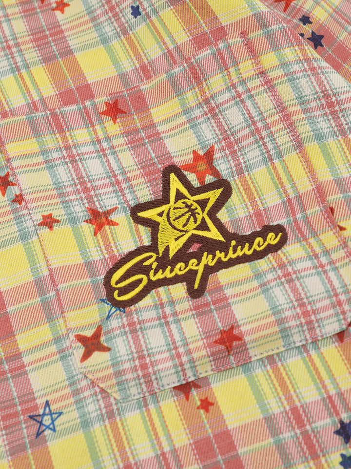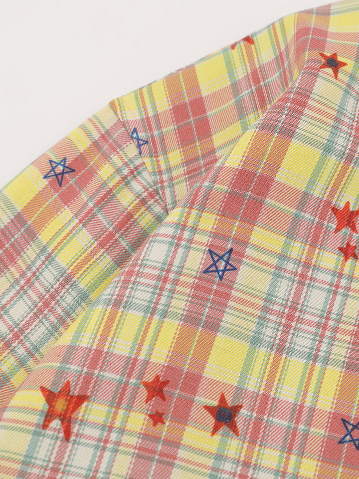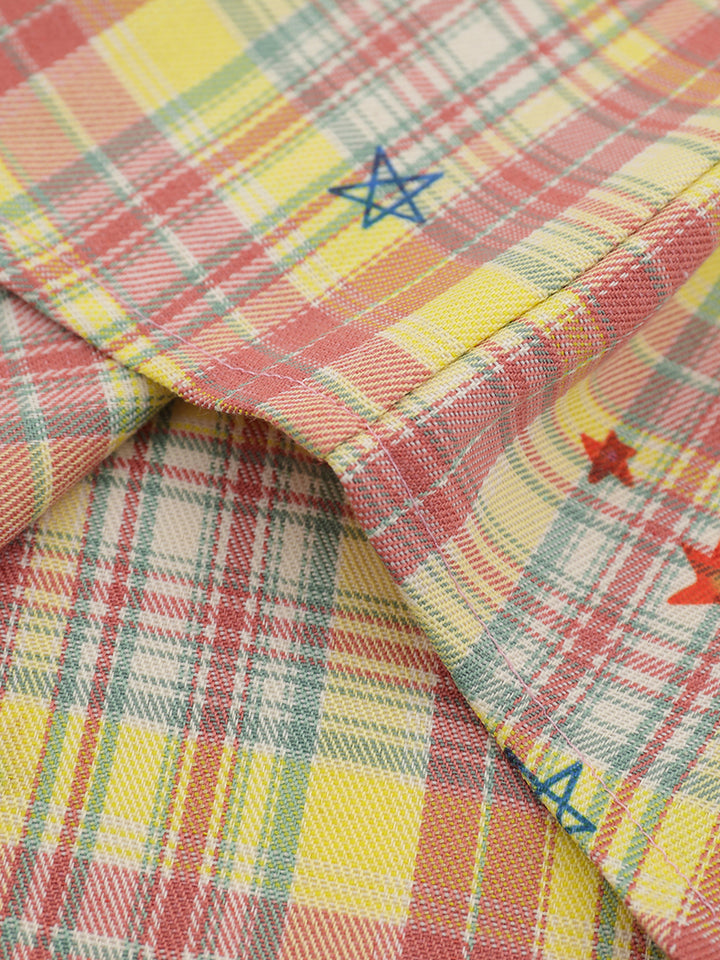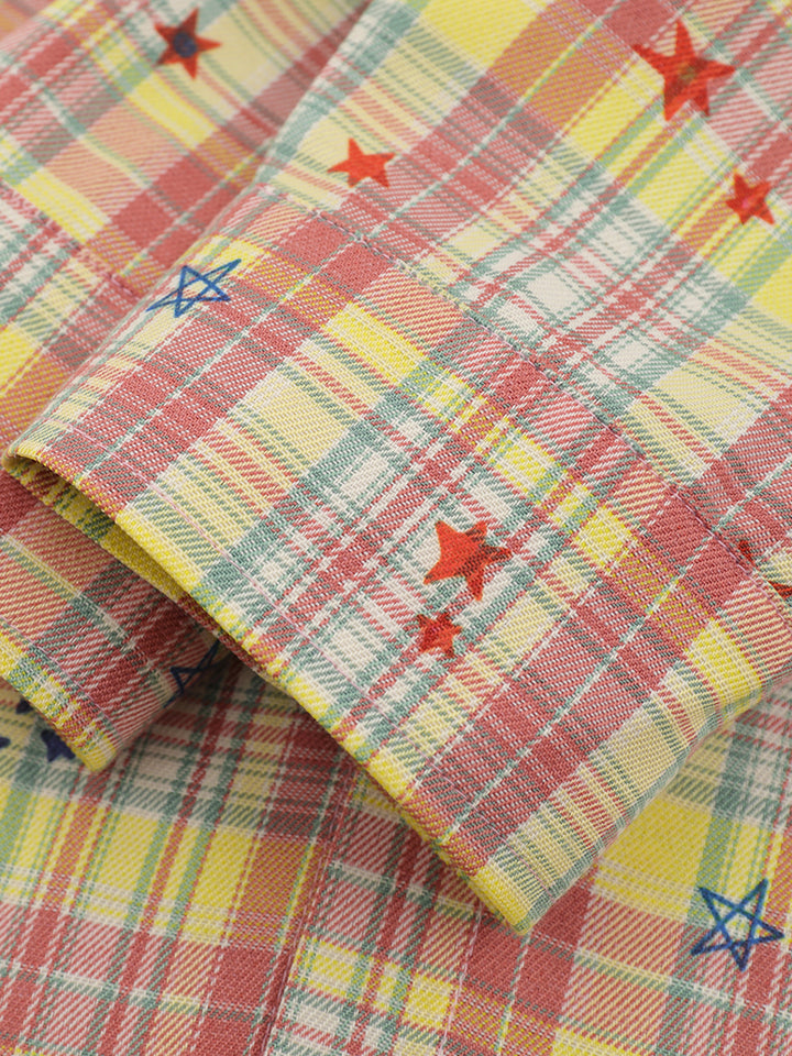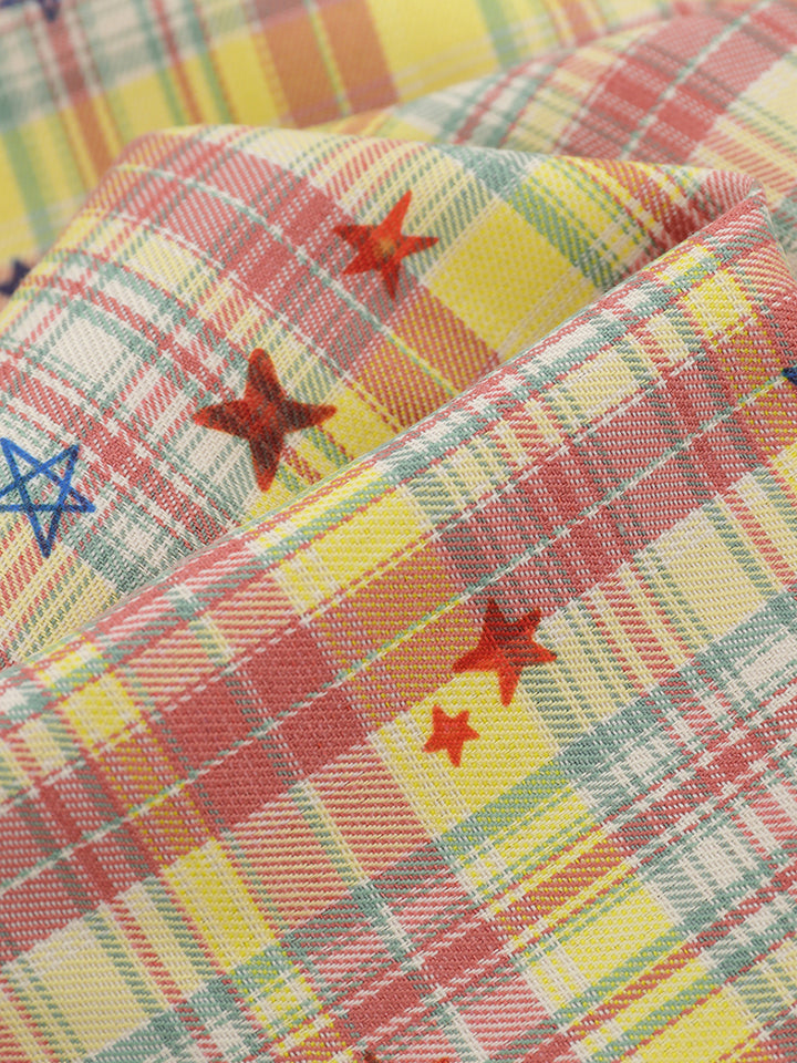 🟨 Vibrant Plaid Pattern – Colorful checkered fabric with scattered embroidered stars adds personality and a lively visual appeal.