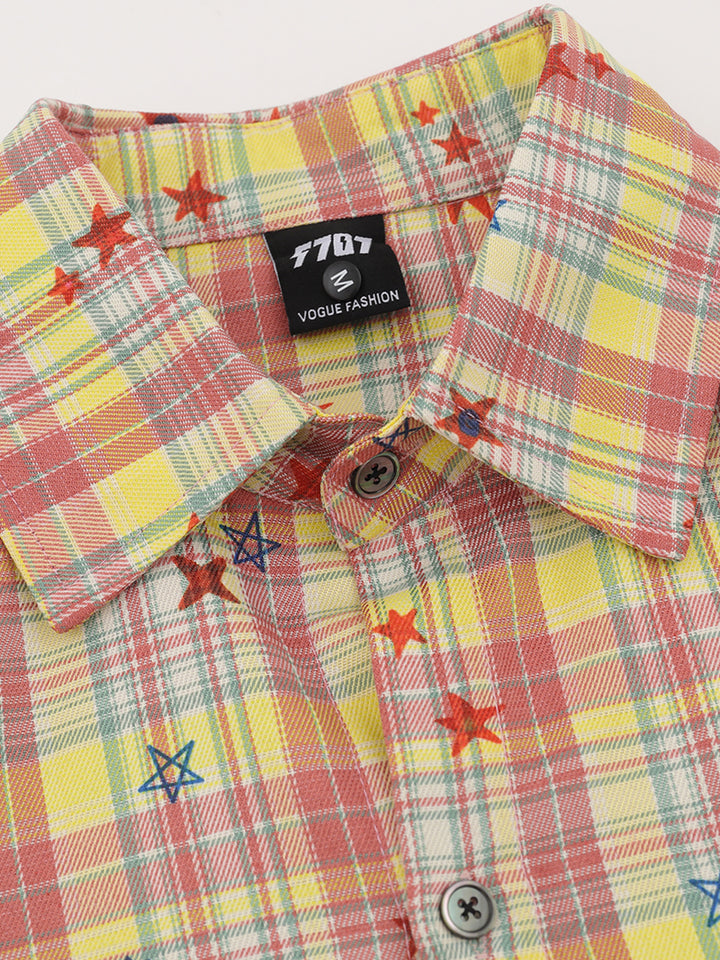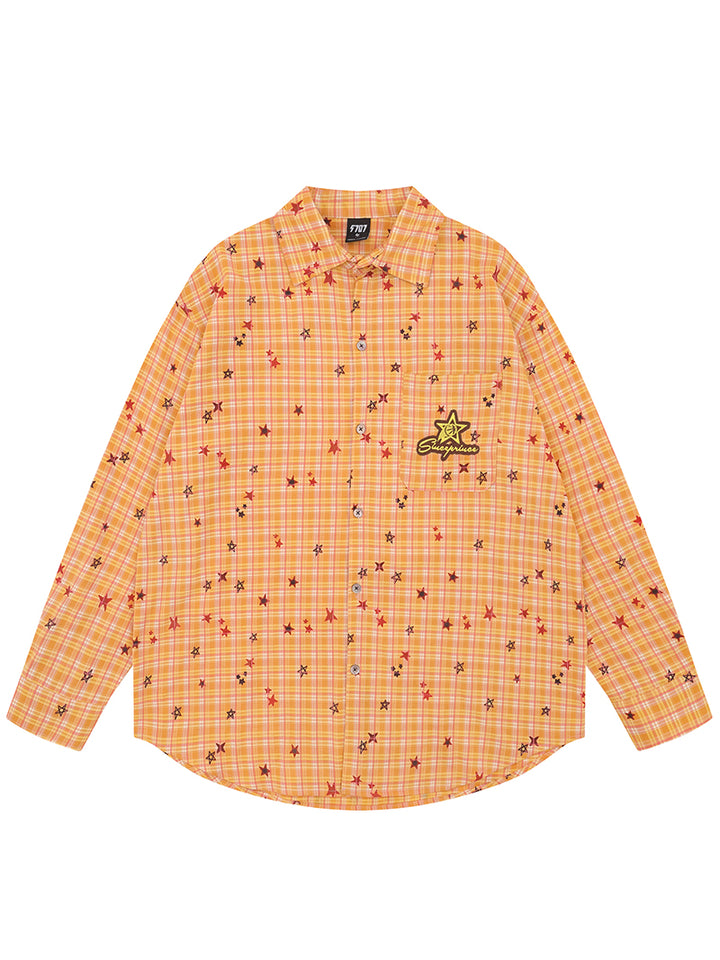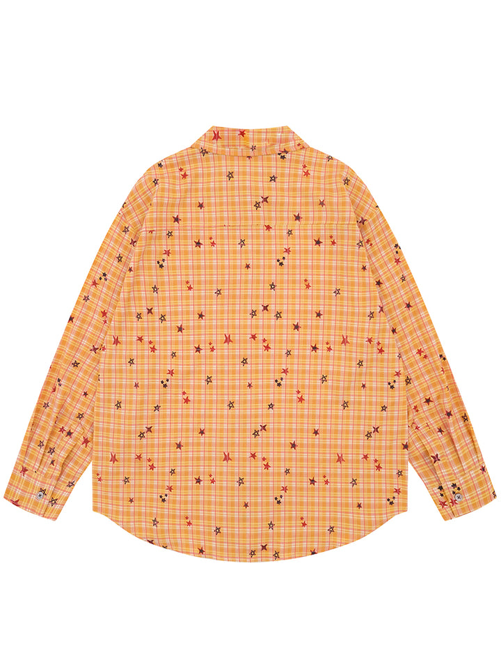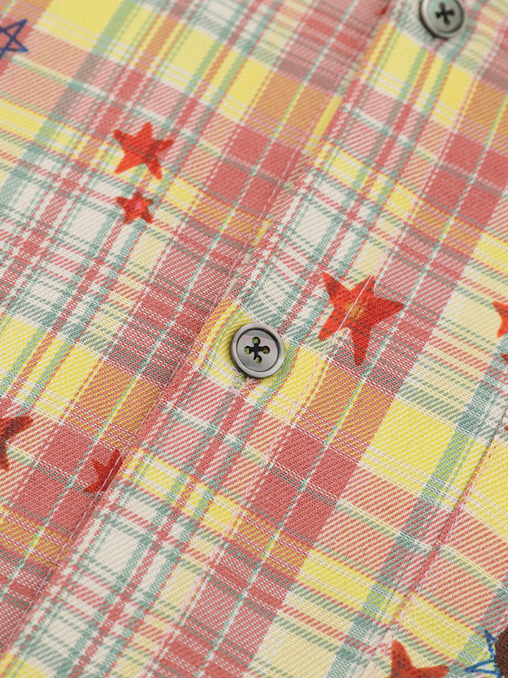 Brighten your everyday style with this standout plaid shirt, adorned with scattered embroidered stars and a charming star-and-dog motif on the chest. The relaxed, oversized fit ensures all-day comfort while giving off a trendy, casual vibe. Made from a breathable blend of 70% polyester, 27% cotton, and 3% spandex, it offers a soft touch, lasting durability, and just the right amount of stretch. Perfect for layering or wearing solo in any season, this shirt combines comfort with playful style—an ideal pick for creative outings, casual hangouts, or adding a pop of personality to your wardrobe.