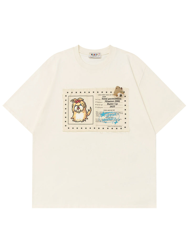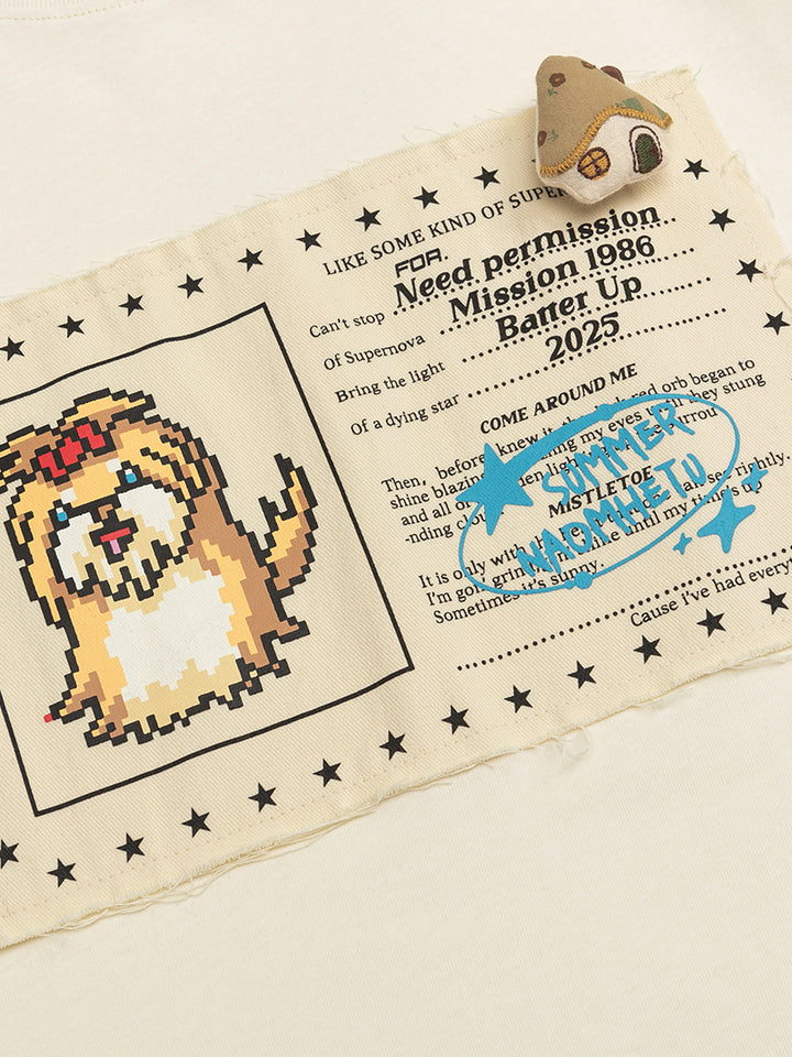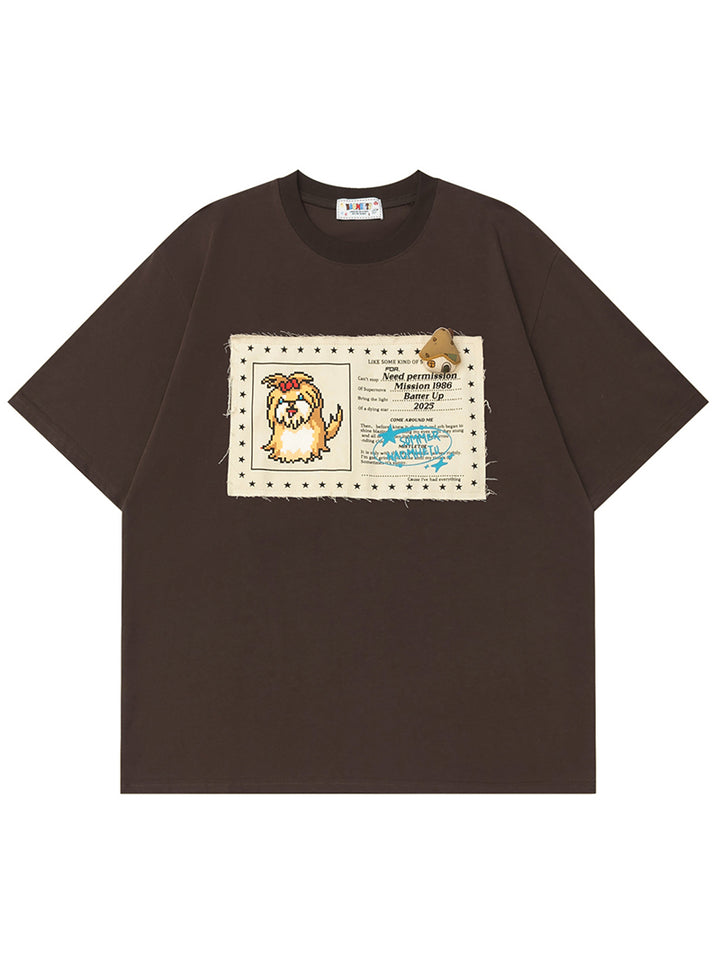 Elevate your fashion game with this playful and artistic oversized t-shirt, designed with a detailed patchwork design and an adorable 3D plush doll accessory. The pixel art-inspired dog graphic, combined with textured fabric and a small stuffed toy detail, adds a unique charm to this casual essential. Available in beige and dark brown, it’s both trendy and comfortable for everyday wear.