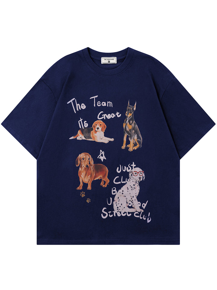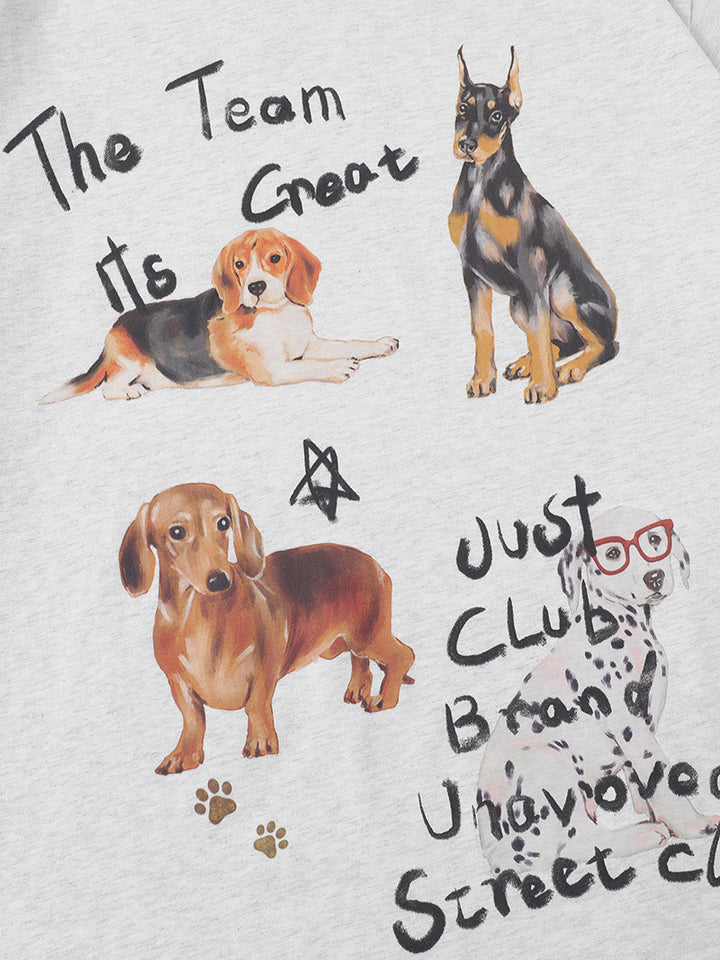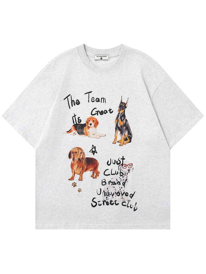 Add a touch of playful charm to your wardrobe with our unisex oversized graphic T-shirt. This eye-catching design features artistic dog illustrations and handwritten-style text, perfect for animal lovers and those who appreciate quirky, artistic fashion.