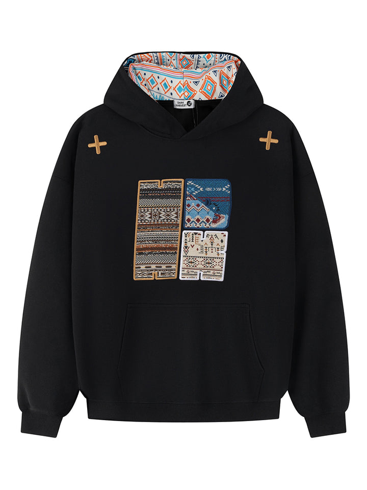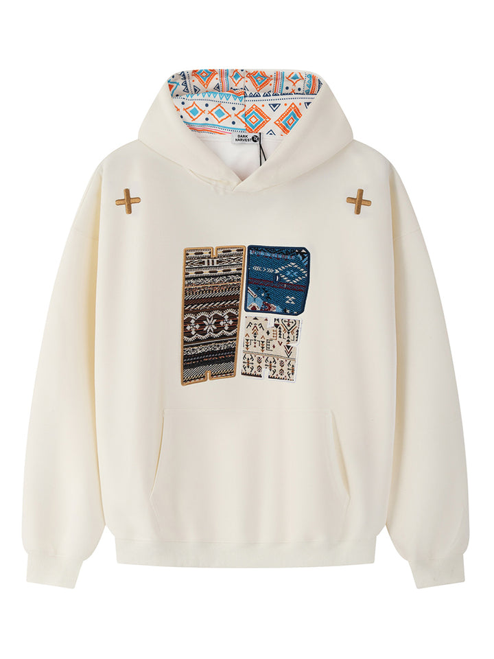 Crafted from a luxurious 450g composite milk silk fleece, this men's hoodie delivers both style and substance. The fabric's outer layer blends cotton and polyester for softness and durability, while the inner polyester layer adds insulation. Stand out with intricate embroidered patchwork inspired by ethnic patterns and a hood lined with tribal motifs for hidden detail. Whether you choose the sleek black or subtle beige, this hoodie offers a unique blend of culture, comfort, and street-ready fashion.