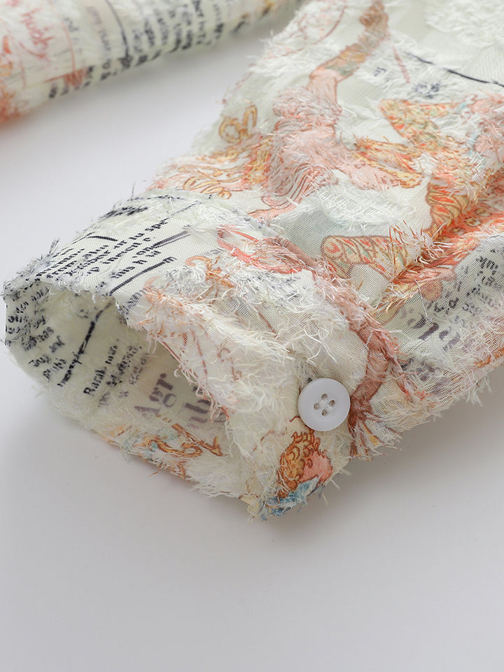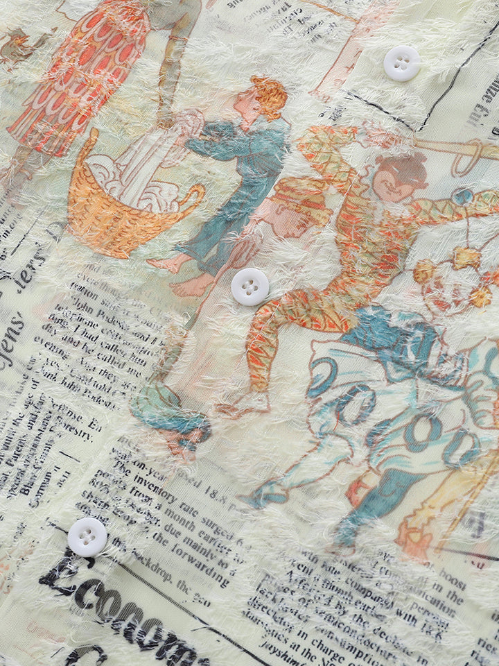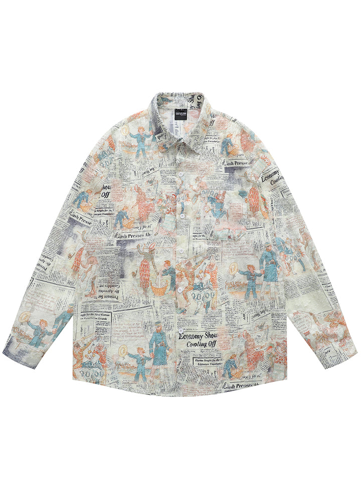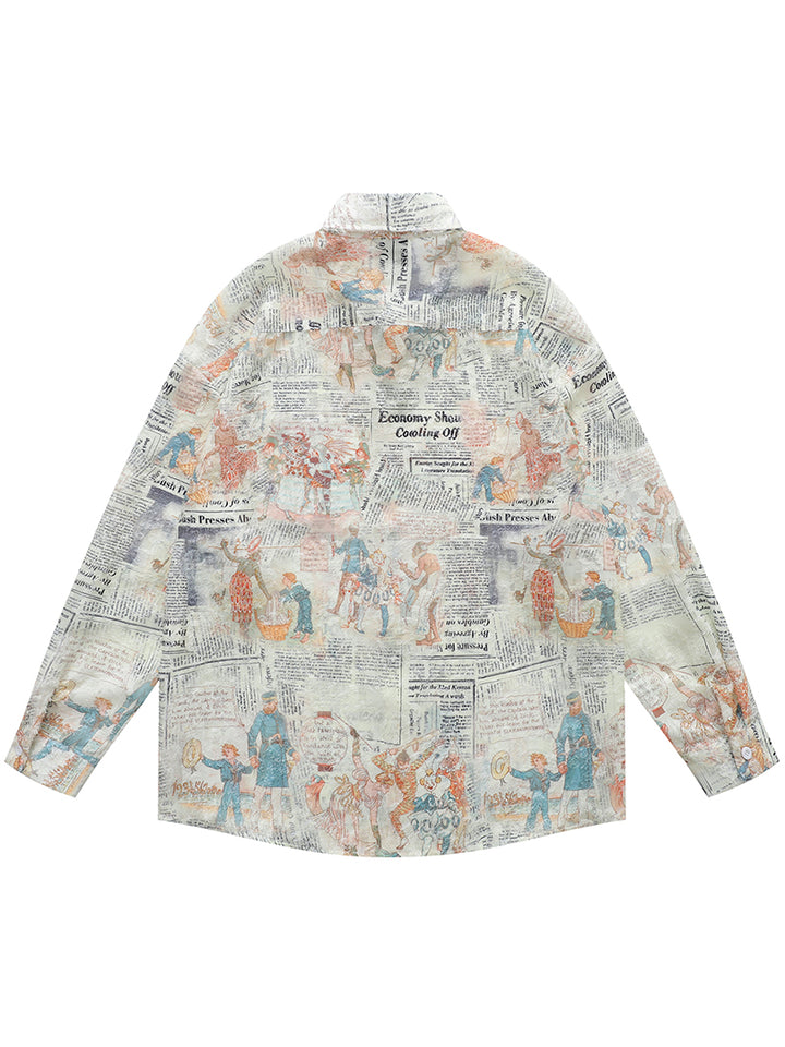 Refresh your wardrobe with this eye-catching jacquard shirt featuring a vintage newspaper-style print in a soft beige tone. Designed with subtle fringe detailing and crafted from 100% polyester jacquard fabric, it offers a refined texture with excellent durability. The relaxed fit and lightweight feel make it perfect for year-round wear, whether styled solo or layered. Available in M, L, and XL sizes, this standout shirt merges retro visuals with modern tailoring — a perfect gift or go-to piece for creative, confident dressers.