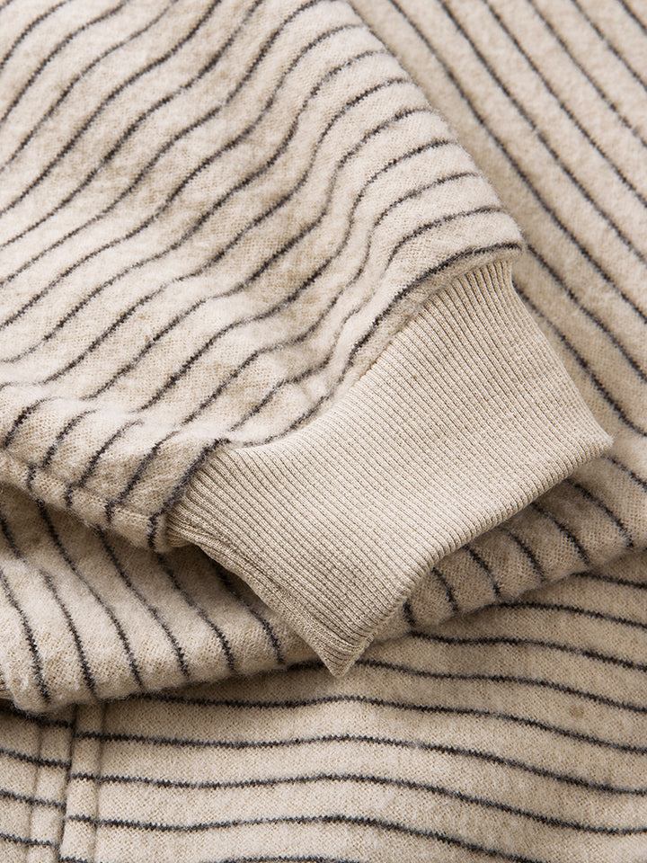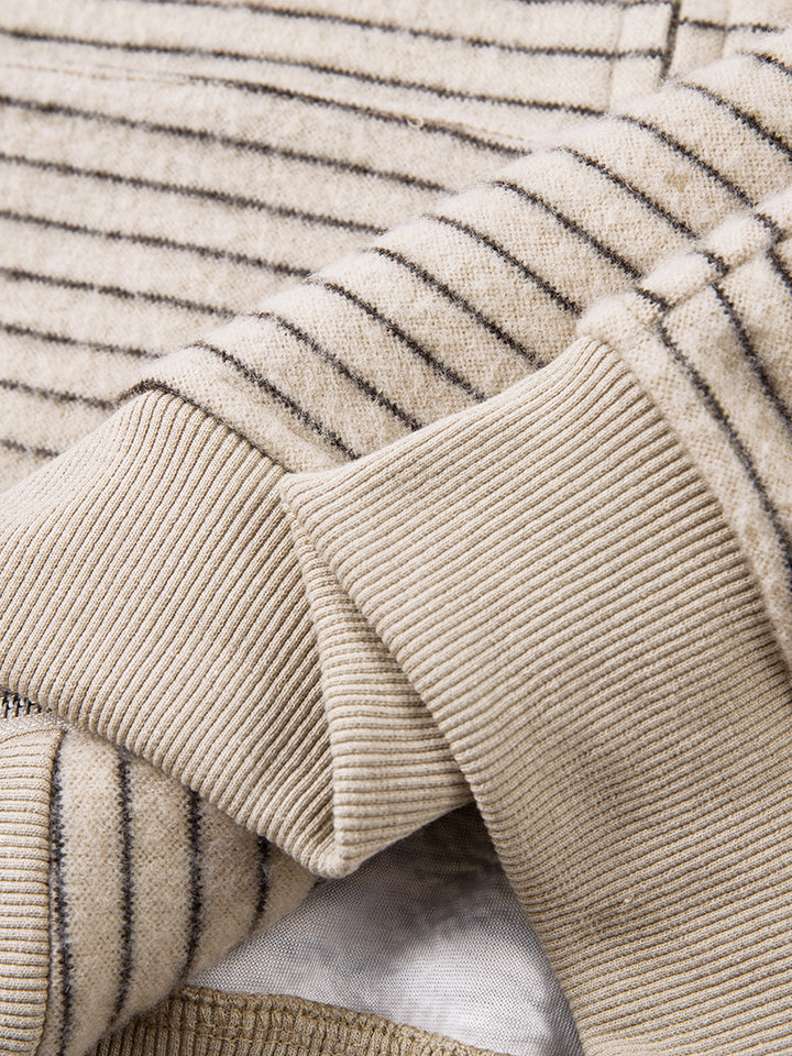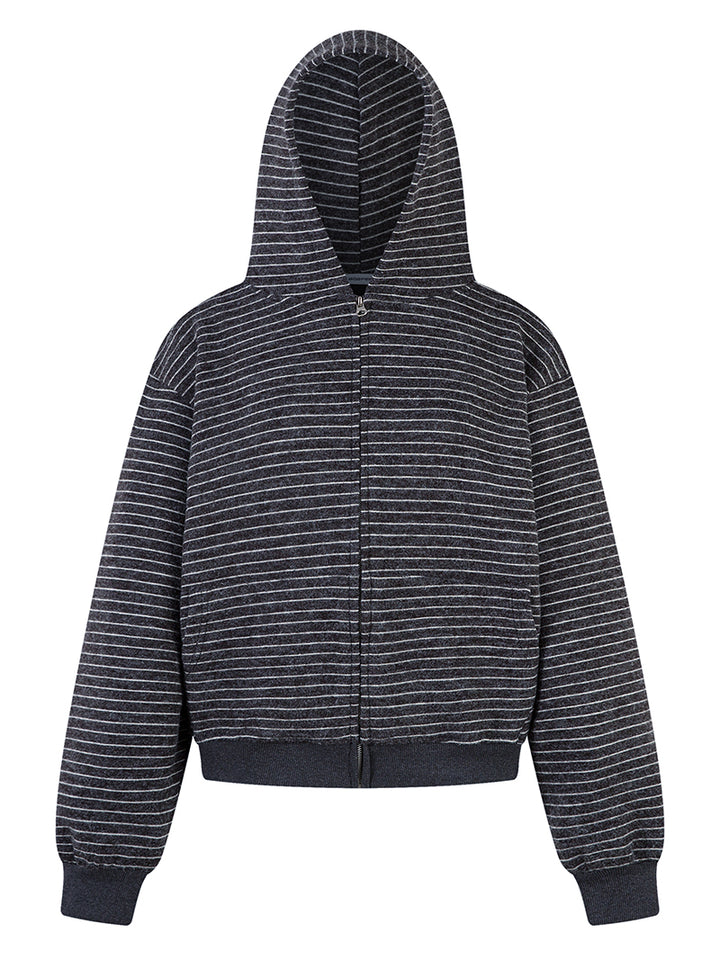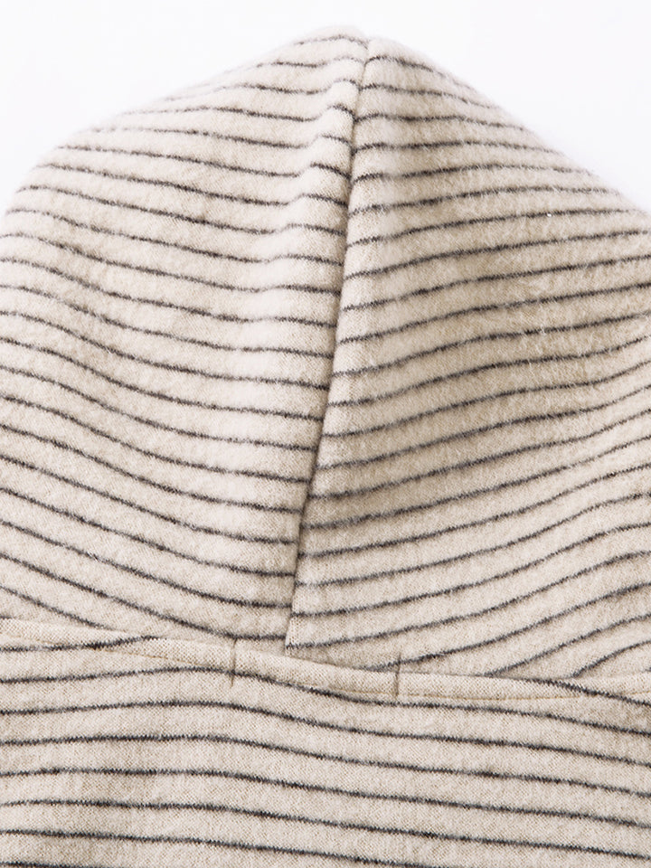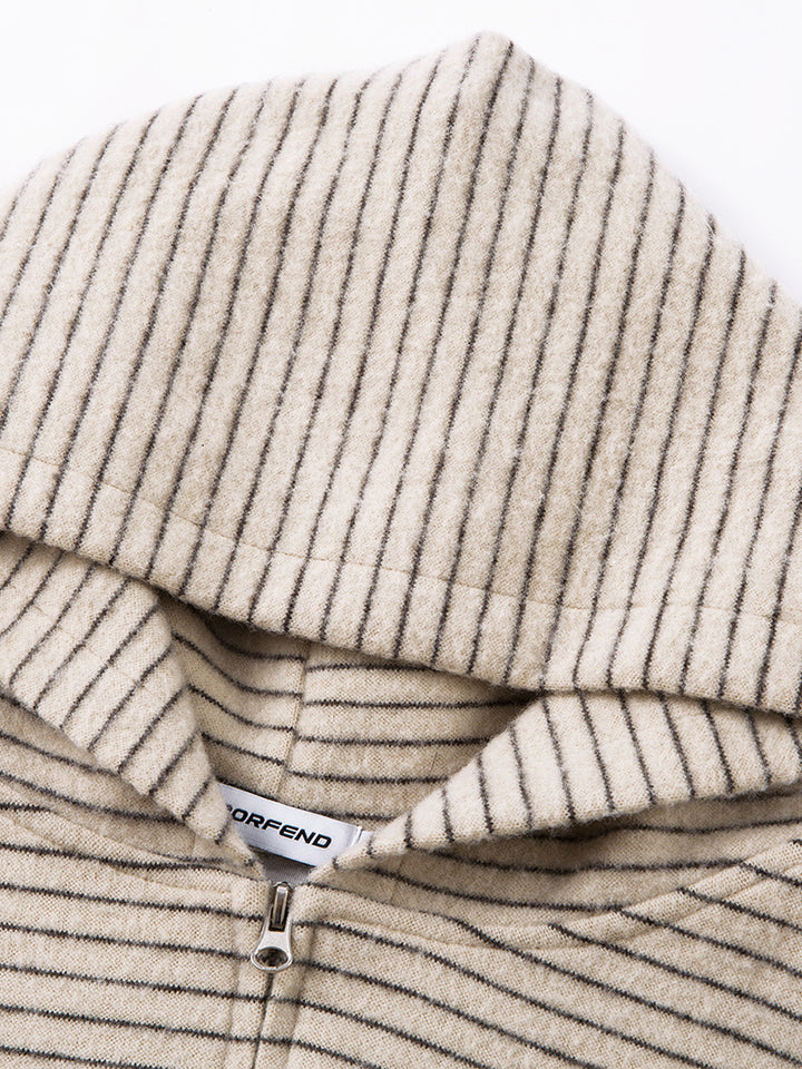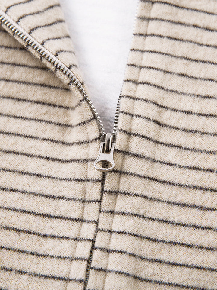 Stay effortlessly stylish and comfortable in this striped knit zip-up hoodie. Crafted from a high-quality acrylic blend with a hint of stretch, this sweatshirt provides warmth, softness, and easy movement. The minimalist stripe pattern gives it a clean, modern look perfect for everyday wear. Designed with practical details like a full front zipper, cozy hood, and front pockets, it’s ideal for layering over your favorite tees or pairing with jeans or joggers. Available in two classic colors—beige and gray—this hoodie makes a perfect choice for casual outings, lounging, or travel.