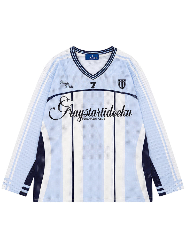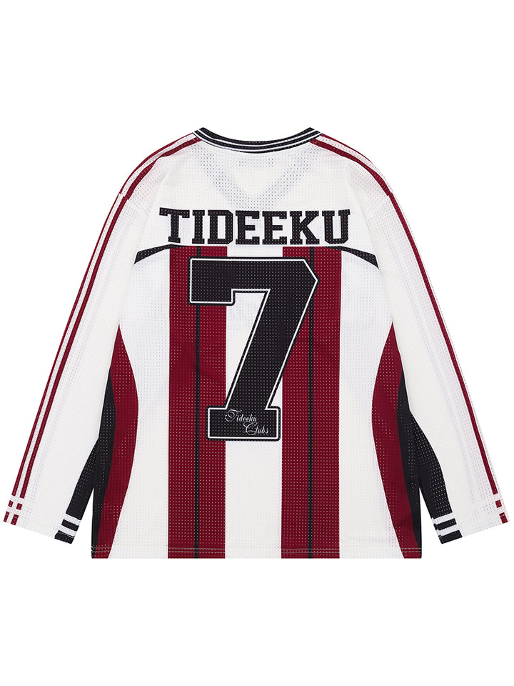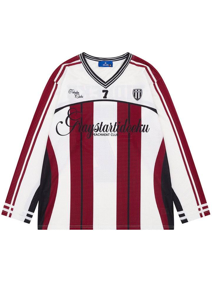 Refresh your streetwear rotation with this bold long-sleeve jersey top, inspired by classic soccer uniforms. Featuring striking vertical stripes and a sporty number detail, this jersey blends retro vibes with modern edge. Crafted from 100% polyester mesh, it offers breathable comfort ideal for everyday wear, workouts, or casual hangouts. The oversized fit adds a relaxed and trendy silhouette. Available in two standout colors—blue and red—and sizes S to XL, this top is perfect for fashion-forward individuals looking to add energy and attitude to their look.
