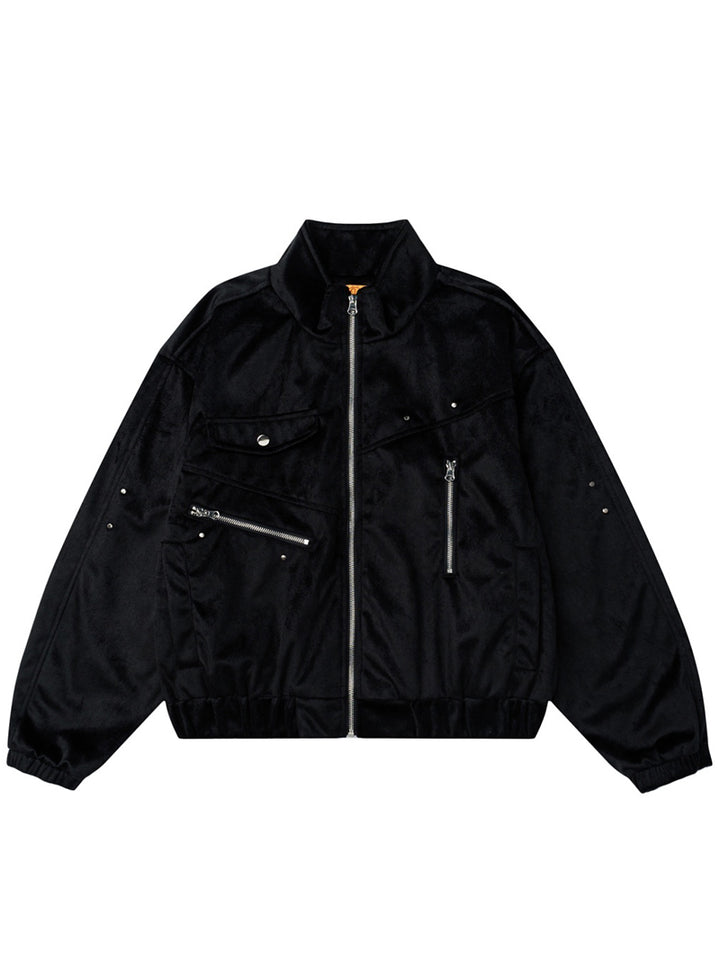 Stylish Design: Features a stand collar, smooth zipper closure, asymmetric pocket design, and subtle metal stud accents.
