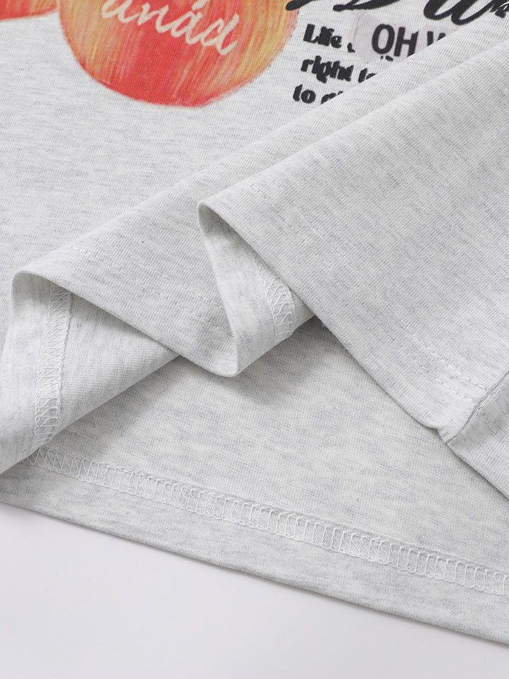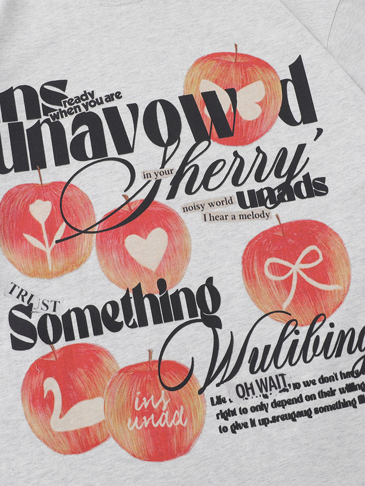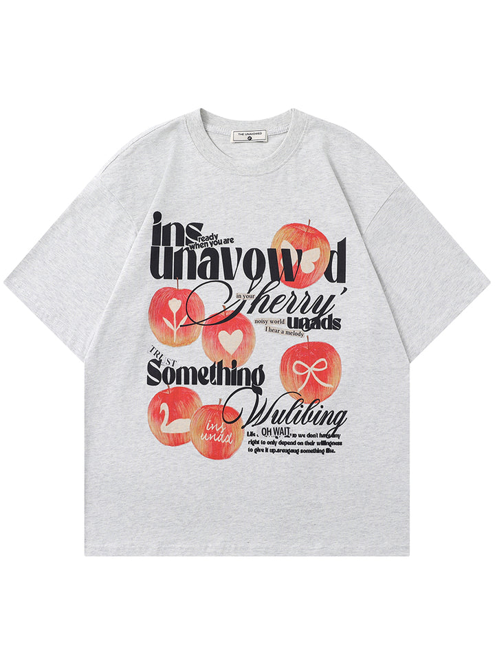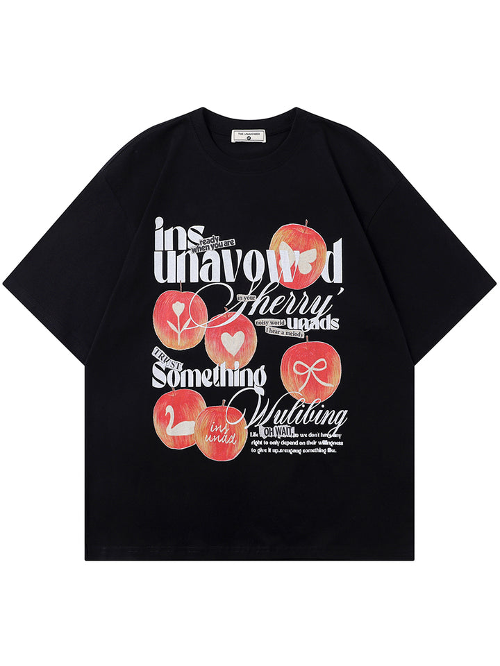 This trendy graphic T-shirt is the perfect addition to any casual wardrobe. Featuring a unique and artistic design with bold typography, whimsical apple illustrations, and playful details, it’s sure to make a statement. The high-quality fabric ensures comfort, while the relaxed fit gives you all-day wearability. Available in both light and dark color options, this t-shirt easily pairs with jeans, shorts, or skirts for a versatile look. Whether you're out with friends or lounging at home, this graphic tee brings an edgy yet fun touch to any outfit.