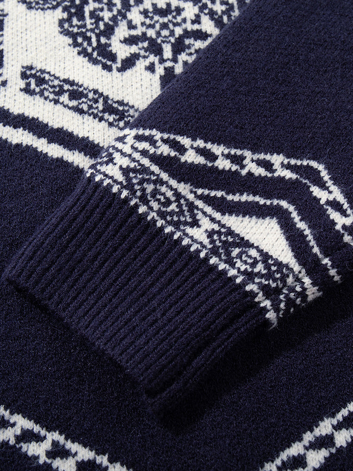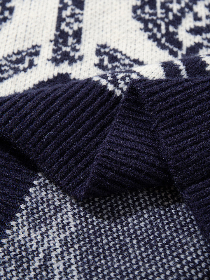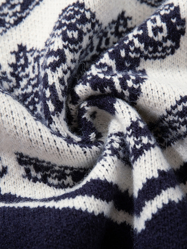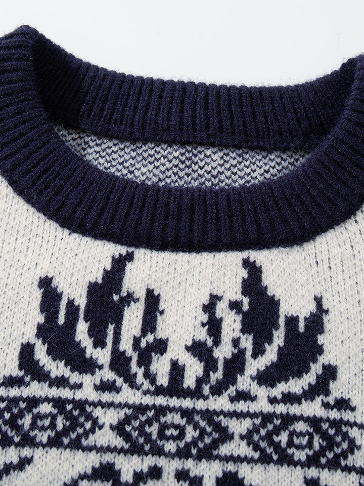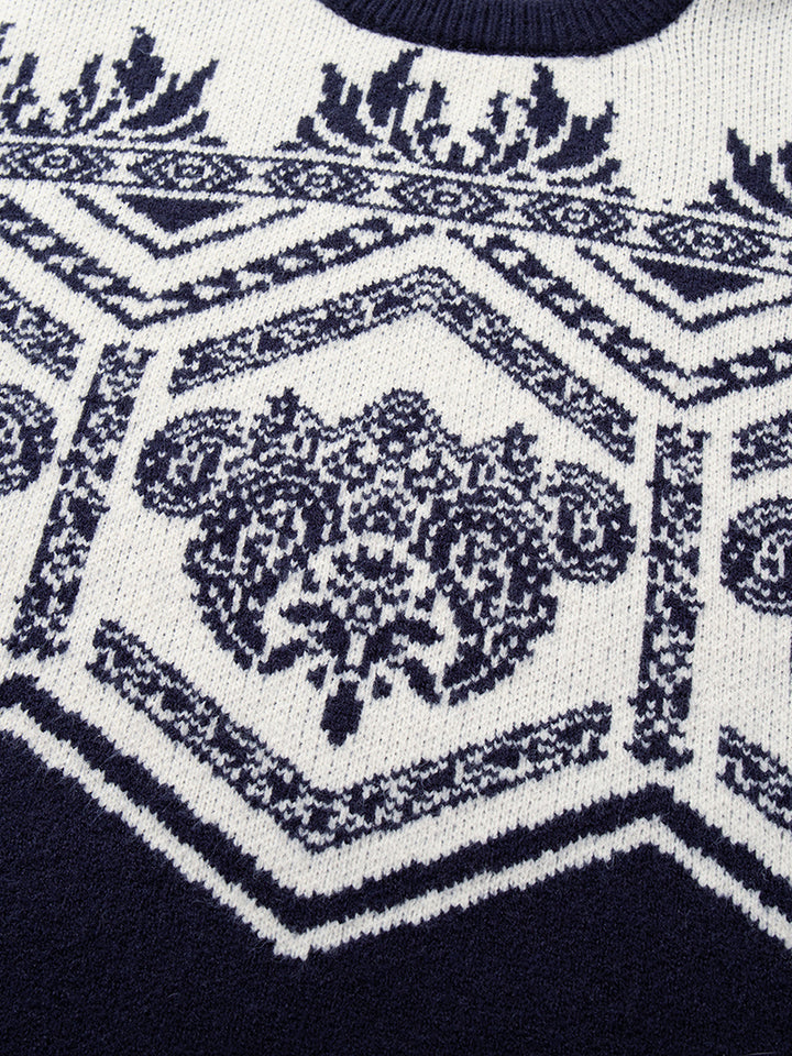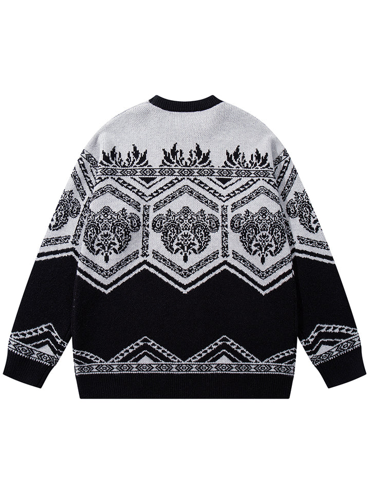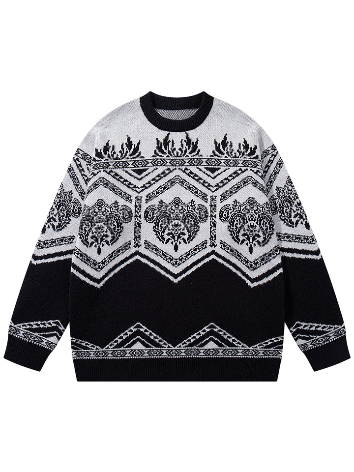 Elevate your winter style with this vintage-inspired knit sweater, featuring a bold jacquard pattern that blends geometric and floral elements for a classic yet modern look. The relaxed oversized fit provides ultimate comfort, making it perfect for casual outings, lounging at home, or layering with coats on colder days. Crafted from soft and breathable fabric, this sweater ensures warmth while remaining lightweight and comfortable. Available in contrasting two-tone colorways, it’s a versatile addition to any wardrobe. A stylish and practical choice, this pullover also makes a thoughtful gift for friends and family during the holiday season.