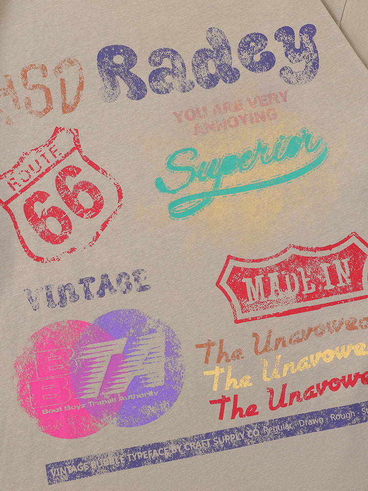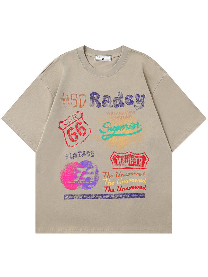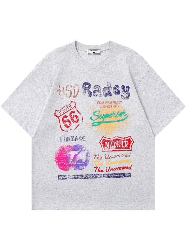 Elevate your streetwear collection with this trendy oversized t-shirt featuring a blend of retro-inspired graphic prints and vibrant colors. Perfect for both men and women, this casual tee showcases a unique combination of vintage motifs, including Route 66 signage, bold typography, and artistic overlays.